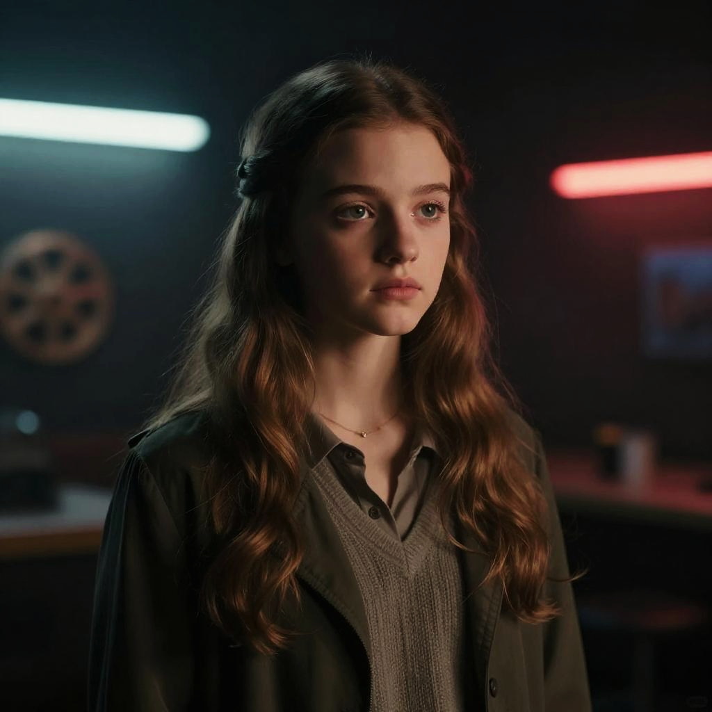 Cinematic film still 1 Caucasian girl, 18 years old, portrait, indoors, professional soft lighting, dark theme, cinematic, neon light, cinematic photorealistic, 8k uhd natural lighting, raw, rich, intricate details, key visual, atmospheric lighting, 35mm photograph, film, bokeh, professional, 4k, highly detailed . shallow depth of field, vignette, highly detailed, high budget, cinemascope, moody, epic, gorgeous, film grain, grainy
