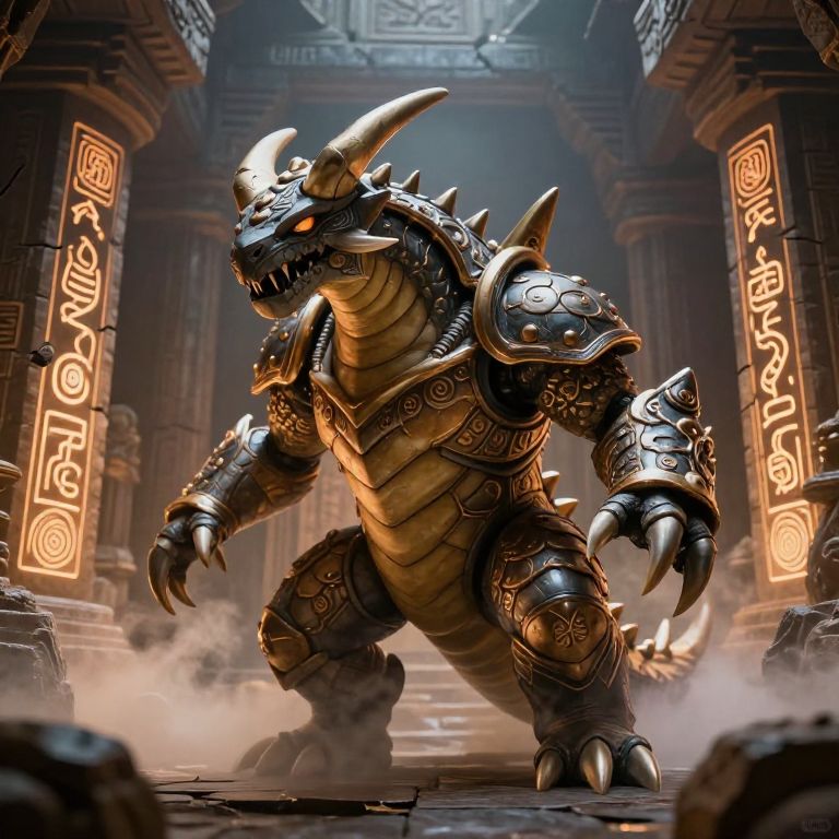 A highly detailed, CGI-rendered image of a fearsome, armored dragon-like creature standing in an ancient, dimly lit temple. The creature has a golden, scaly body with black, ornate, spiked armor covering its muscular frame. Its head features sharp horns and glowing orange eyes, while its mouth is open, revealing sharp teeth. The temple background has tall, illuminated pillars with glowing runes, adding a mystical atmosphere. Mist rises from the stone floor, enhancing the dramatic effect. The image combines fantasy and realism with a dark, epic tone.