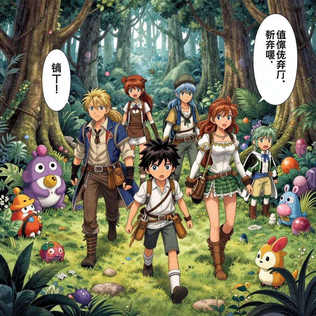 Anime-style forest scene with five adventurers, diverse characters, colorful creatures, and Japanese speech bubbles. Bright, detailed, and vibrant art.