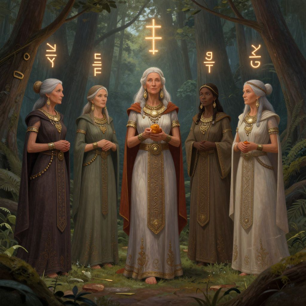 Matriarchy concept portraying a council of wise women elders in an ancient forest, mystical atmosphere with glowing runes, serene expressions, elaborate ceremonial attire, soft ambient light filtering through trees, digital painting with detailed character design and natural elements.