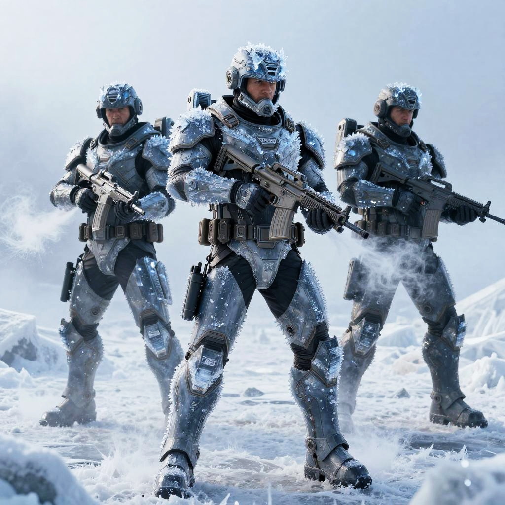 R6 operators iced out, elite counter-terrorism team wearing armor encrusted with shimmering ice crystals, standing in a frozen wasteland with frost fog, high-tech gadgets emitting cold vapors, sharp focus on icy textures and frozen breath, dynamic action pose