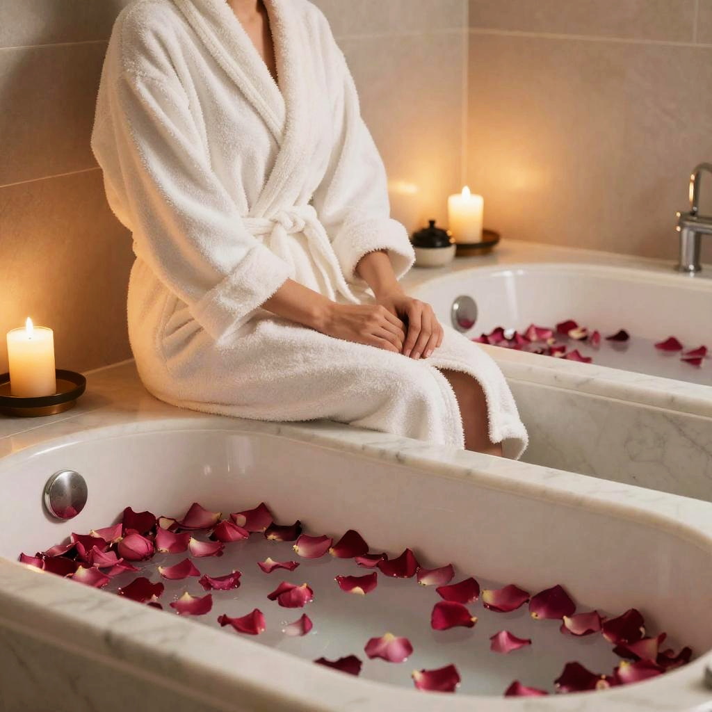 Luxurious spa scene with plush robes, scented candles, marble bathtubs filled with rose petals, and soft ambient lighting, creating a serene and indulgent atmosphere focused on comfort and relaxation.