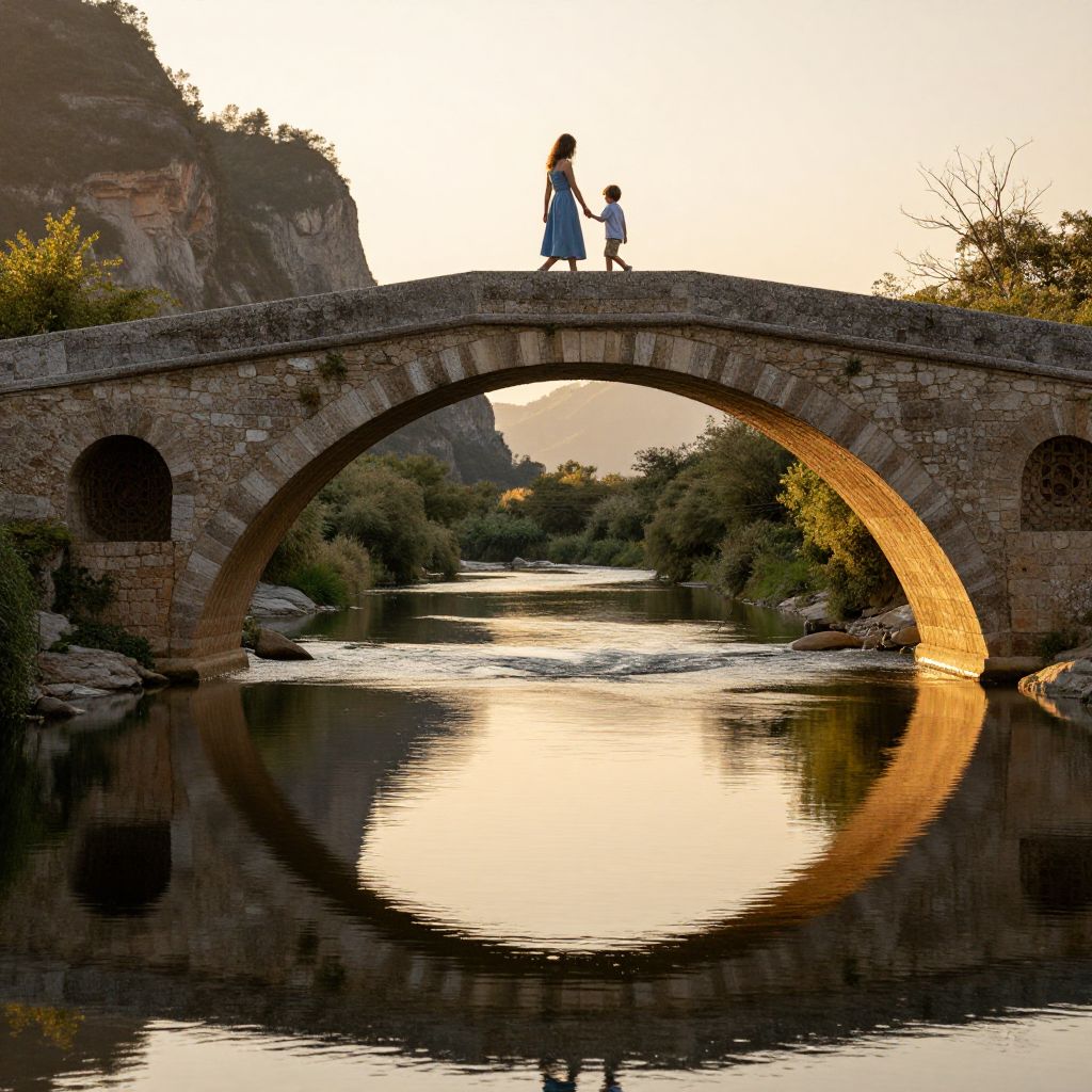 Sunset bathes a serene stone arch bridge spanning a tranquil river, as a woman in a blue dress and a child walk hand-in-hand toward distant cliffs, framed by golden light and mirrored reflections.