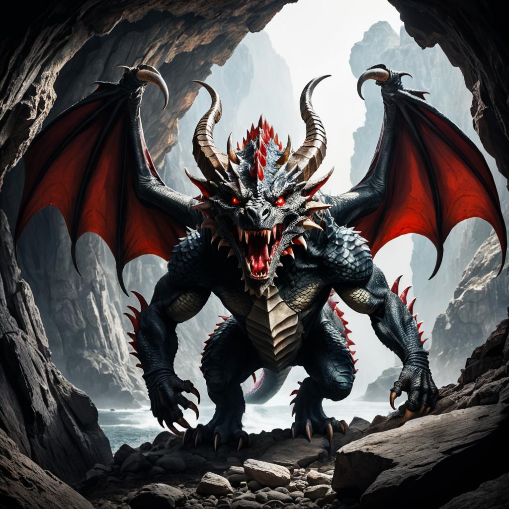 Digital illustration of a fierce dragon with red and black scales, large horns, sharp claws, and glowing red eyes. The dragon is depicted in an aggressive stance with its mouth open, showcasing sharp teeth. The background features a dramatic rocky landscape with cliffs and a cave-like environment.