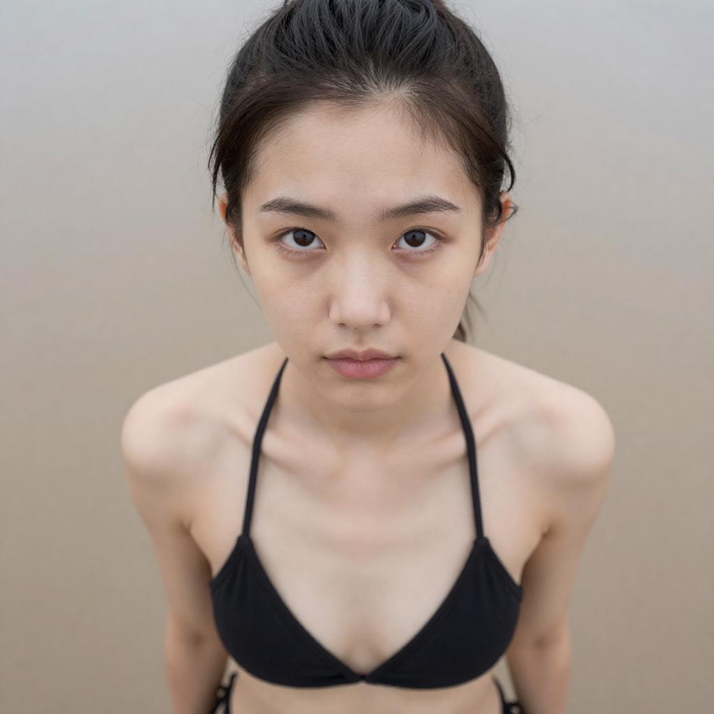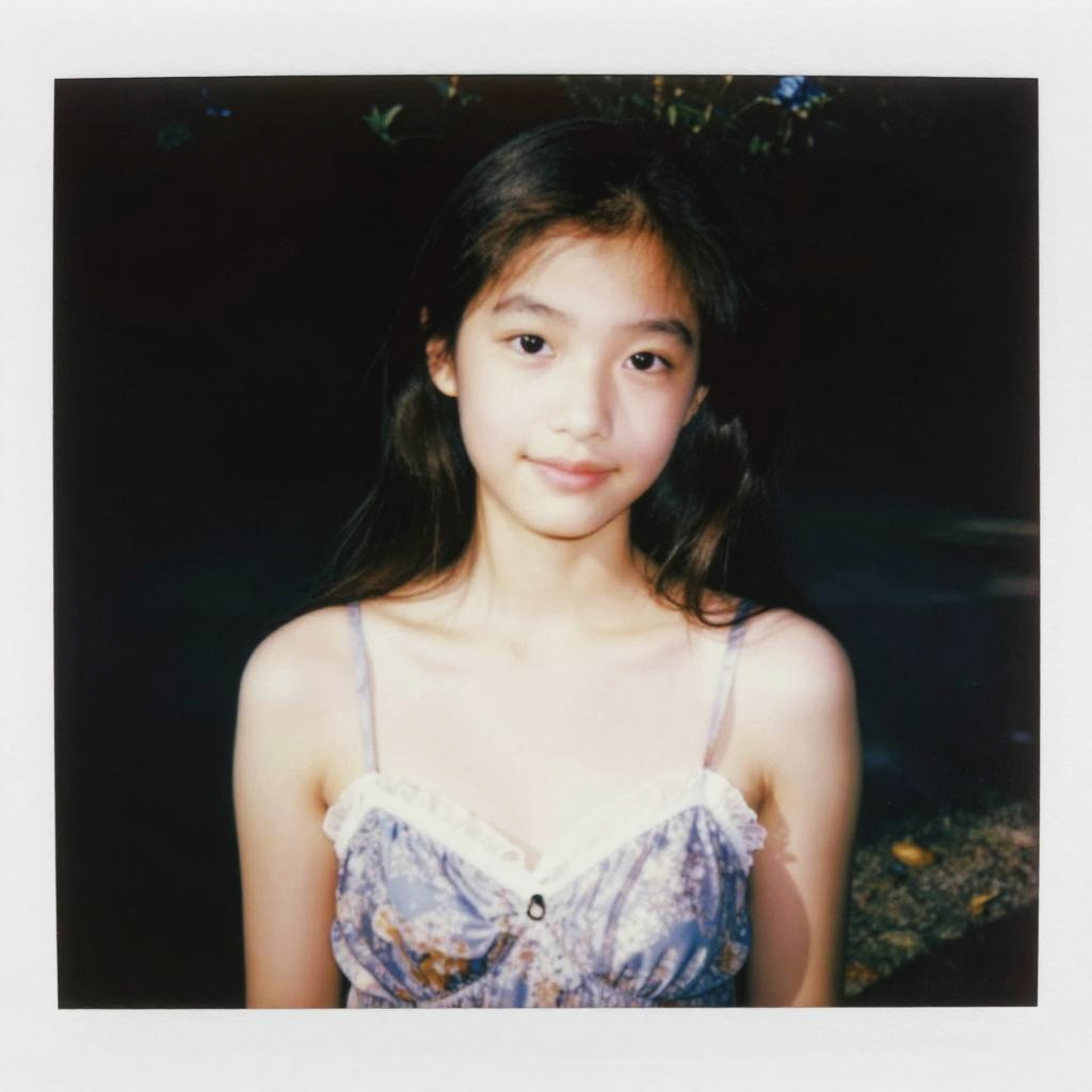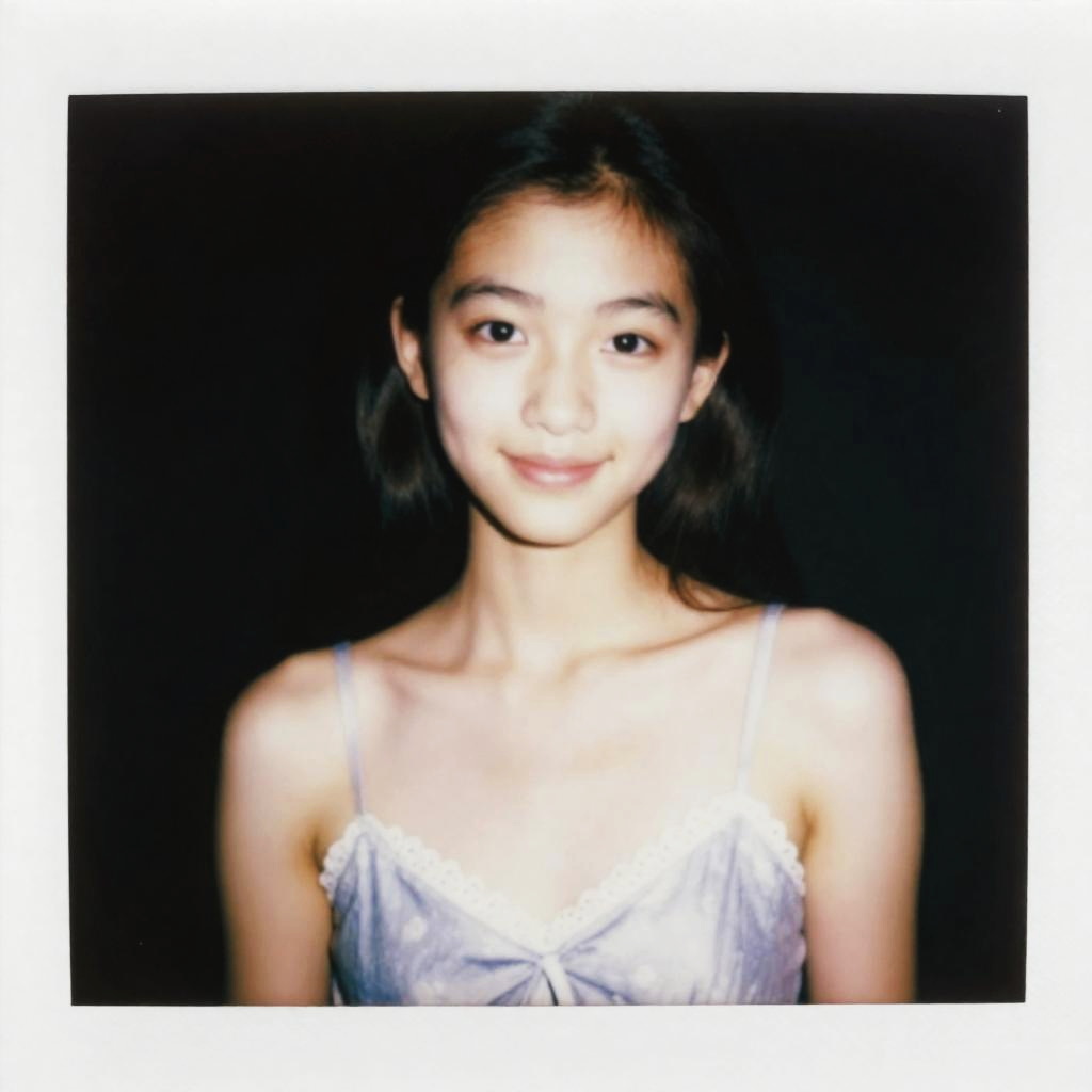 Polaroid-style portrait of an 18-year-old East Asian woman with long dark hair wearing a light purple sundress with thin straps and a lace-trimmed sweetheart neckline. The image features soft lighting and smooth skin texture, highlighting her subtle smile and classic beauty with a minimalistic black background.