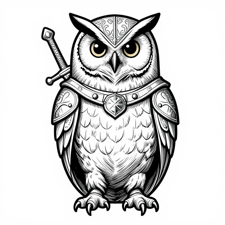 The image depicts a fantasy owl, rendered in a detailed line drawing style with thick black lines on a white background. The owl is front-facing, showcasing its head and shoulders, and is alone with no background elements. It is adorned in armor, including a helmet with intricate designs, a breastplate, and a cloak that drapes over its wings. The owl's wings are spread slightly, revealing the detailed feather texture. A sword is tucked into the owl's right wing, adding to its warrior-like appearance. The overall composition is balanced, with the owl centrally positioned and the armor and sword creating a sense of depth and dimension. The image exudes a sense of strength and readiness, typical of a fantasy warrior theme.