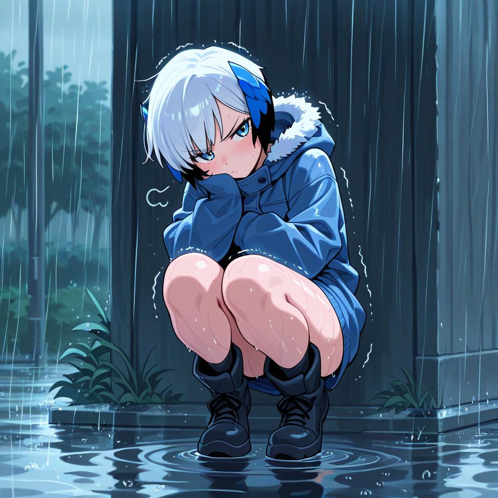 Masterpiece, best quality, Gwendolyn_Tennyson, 1girl, solo, (wet, rain, outdoors, cold, trembling, :1.1), annoyed, head tilt, full body