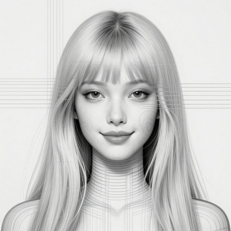 This digital drawing in a monochromatic, high-contrast style features a young woman with long, straight, platinum blonde hair and bangs. Her facial features are soft, with a slight smile, large eyes, and light-colored lips. The background consists of intersecting black lines creating a grid-like pattern, adding a sense of depth and texture. The image has a clean, modern aesthetic, with a focus on the woman's serene expression and delicate hair. The overall style is reminiscent of vector art, with smooth lines and precise detailing.