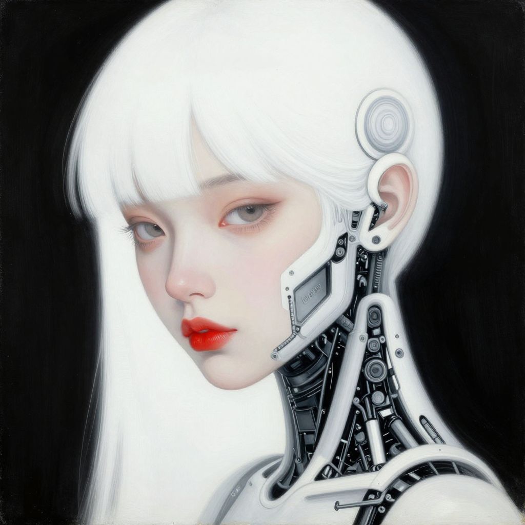 Monochrome greyscale pop surrealism, Pop Art, minimalism, grignani, Closeup Portrait, An Abstract surreal n Abstract surreal black and white simple painted newage cyborg spacegirl with long vibrant hair throughout the frame made, of lines, monochrome high collar, blushed smiling, in Outer space, made of lines, vertical lines, horizontal lines, Portrait Made of intertwining lines, weaving over and under each other throughout the frame, emphasis effect, moire effect, awash in Grey and white shades, seamlessly extends the lines