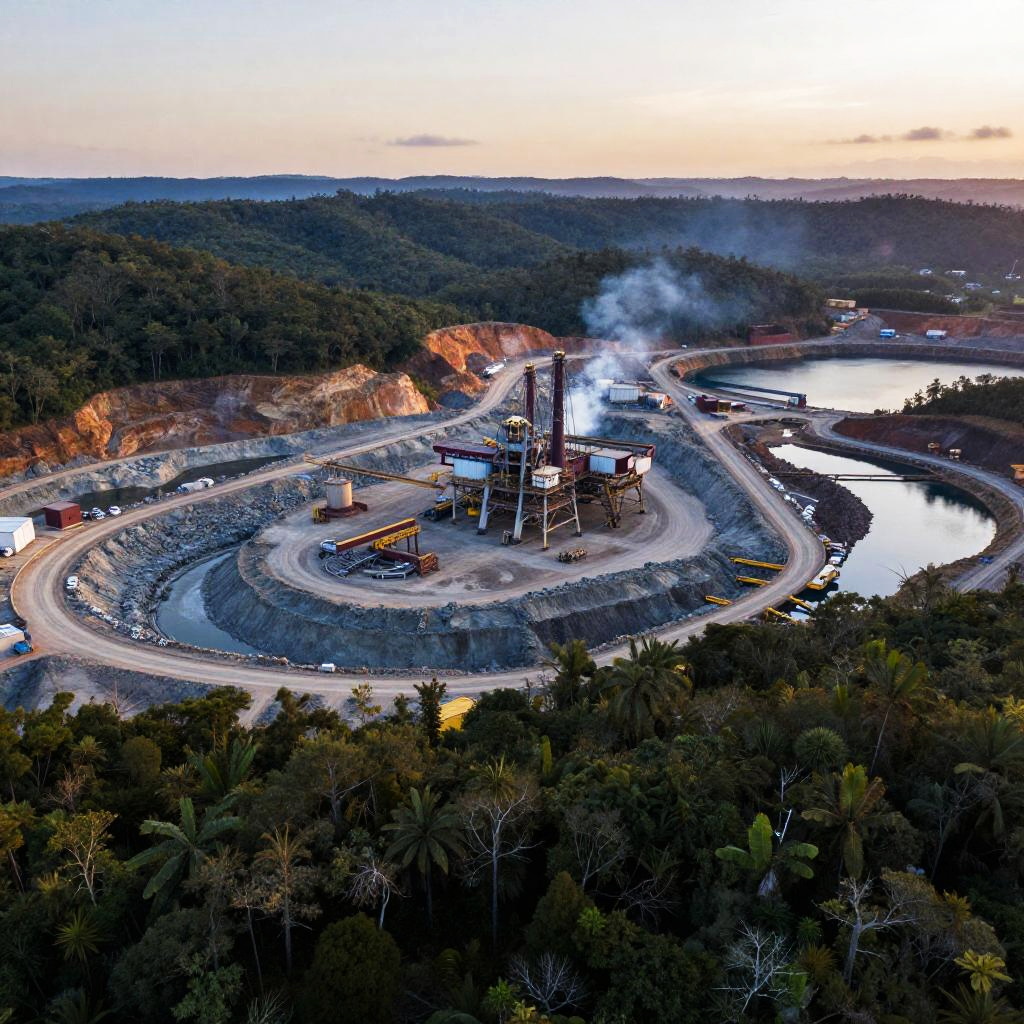 Aerial view of AngloGold mining complex surrounded by lush green forests, pristine water bodies reflecting sunrise, integration of industrial and natural environment, inspiring contrast between nature and industry, photo-realistic detail, panoramic landscape