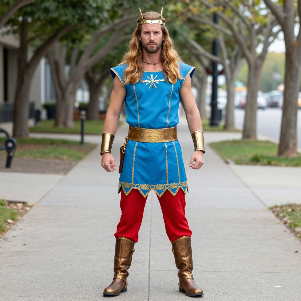 Photograph of a man standing on a suburban sidewalk with trees and houses in the background. He has long, wavy, blonde hair, a beard, and is wearing a golden crown. His outfit includes a blue tunic with gold trim and a white star emblem on the chest, red pants, and brown leather boots. He also wears gold arm cuffs and a wide, gold waistband. The scene is brightly lit with natural daylight, and the man stands confidently with his hands by his sides. The street is lined with green grass and trees, and the sidewalk is clean and smooth.