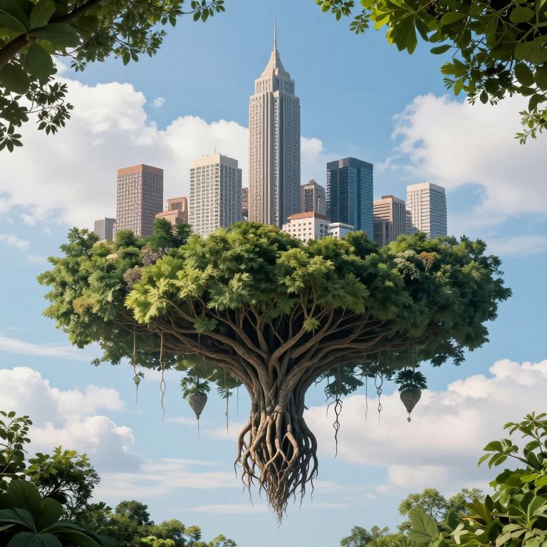 Digital artwork of a tree with a dense, green canopy supporting a futuristic cityscape of tall skyscrapers against a bright blue sky. Tree roots d