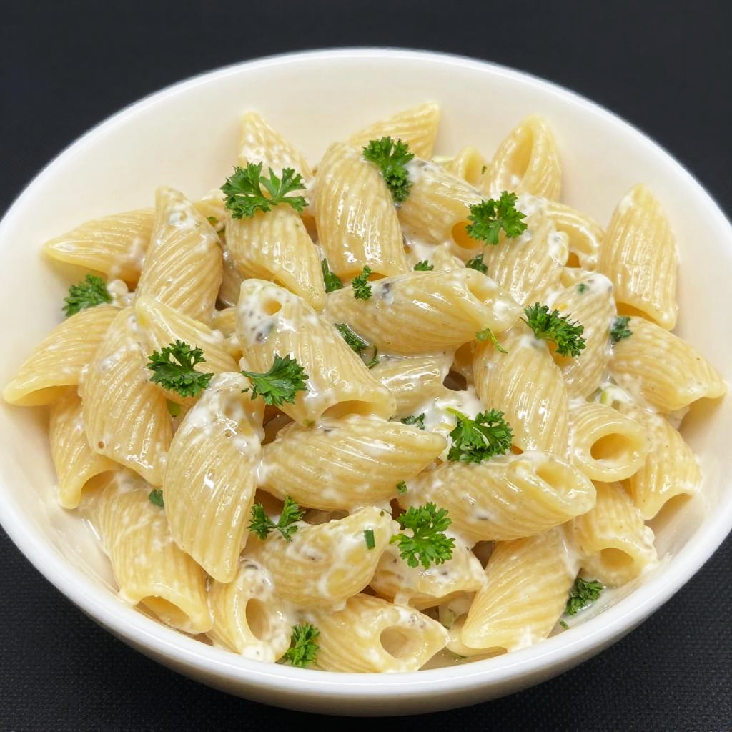 A close-up photograph of a white bowl filled with creamy, pasta salad. The pasta is coated in a light, creamy dressing, topped with chopped green parsley. The bowl is centered on a black, textured fabric background. The pasta looks slightly al dente, and the creamy dressing gives it a glossy appearance. The parsley adds a fresh, green contrast to the pale pasta and dressing.