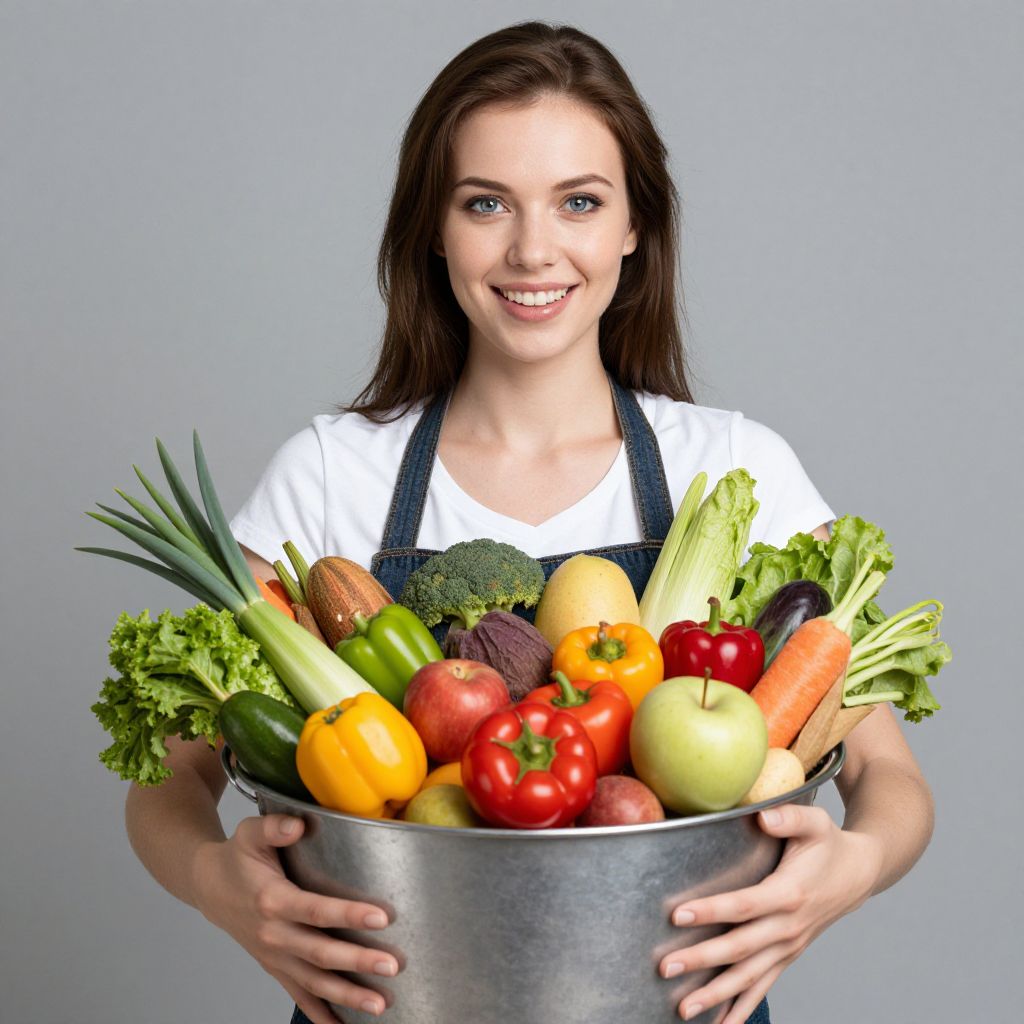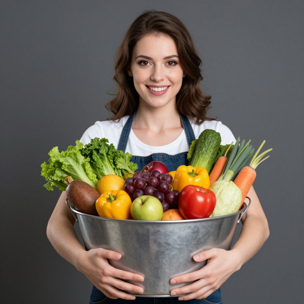 Caucasian woman people with bucket full of coloured and mixed fresh healthy food like fruit and vegetables royalty free stock photography