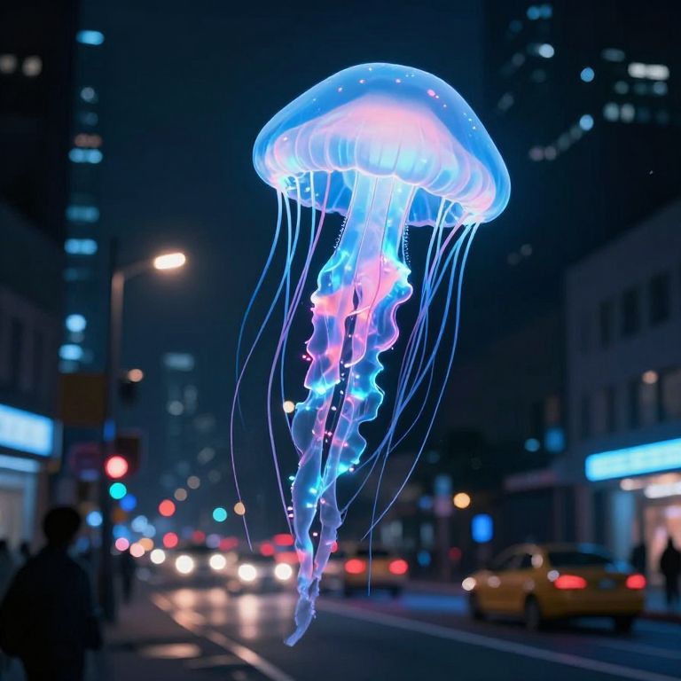 A colossal jellyfish, pulsing with neon light, floats peacefully through a city's streets, replacing traditional traffic with gentle luminescent rhythms.
