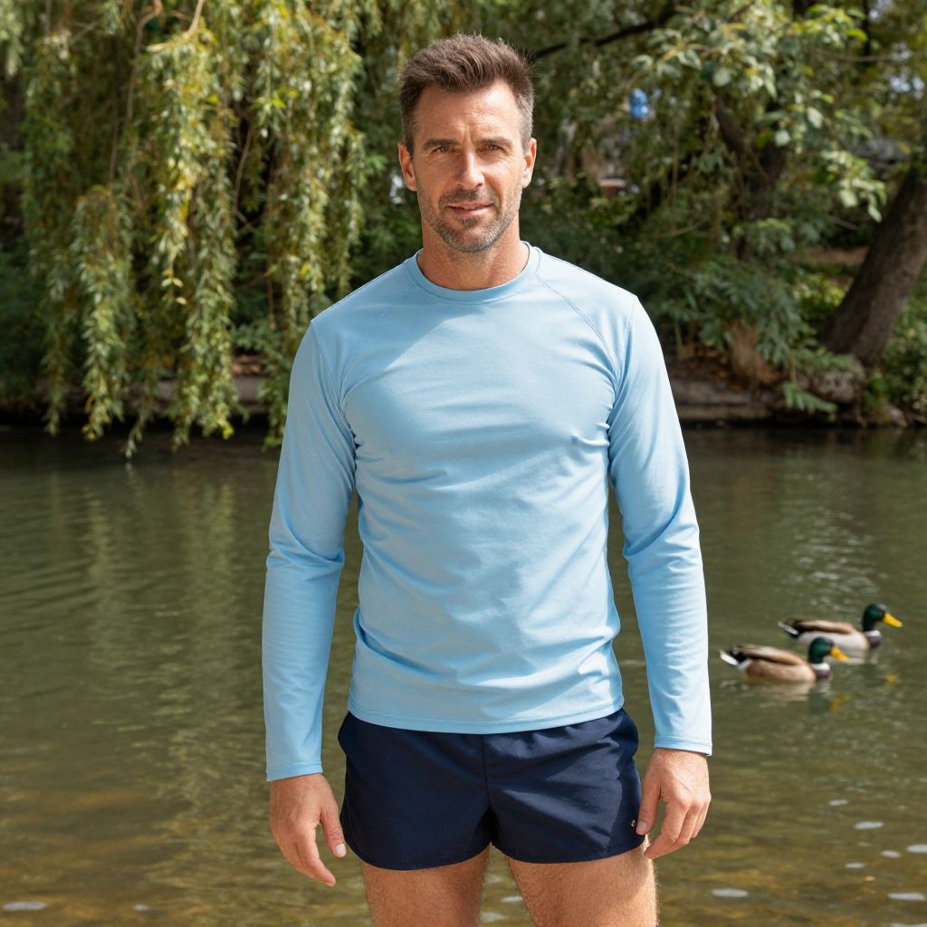 A man, light blue long sleeve rash guard, navy swim trunks, quick-dry fabric, relaxed fit, sporty vibe, sun-drenched riverbank, willow trees swaying, ducks gliding on water, vintage photo style, cheerful expression Man has masculine face and piercing eyes