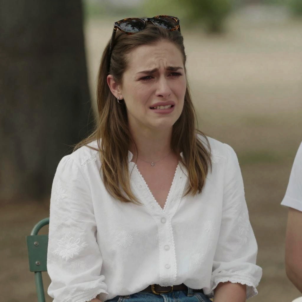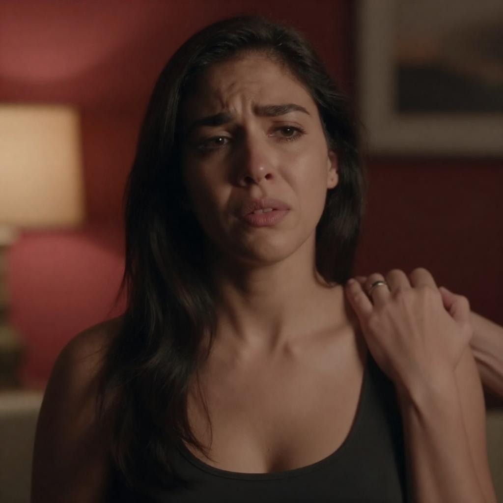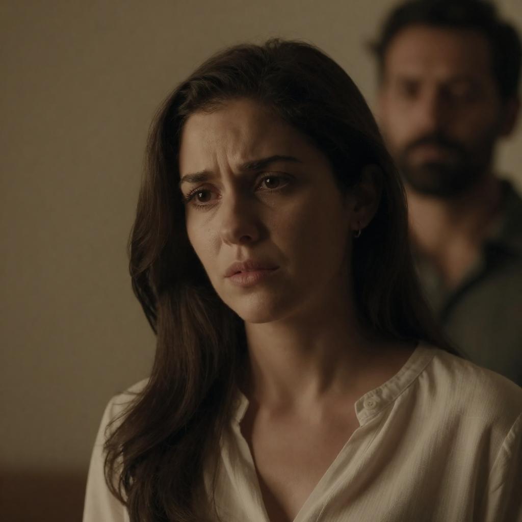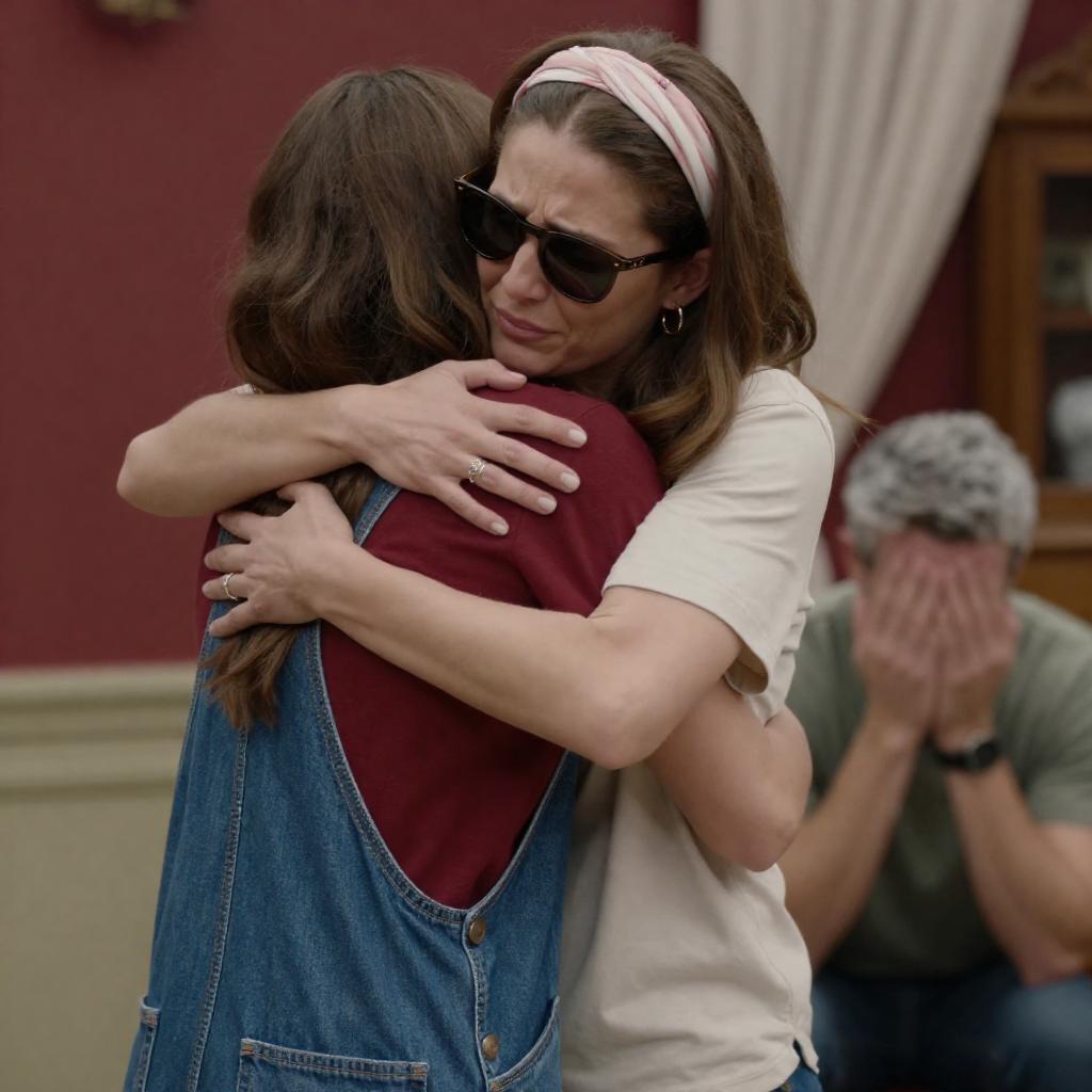 Photograph of two women in an emotional hug. One woman with long brown hair, wearing a pink and white headband, sunglasses, and a beige shirt, embraces another woman with long brown hair, wearing a red shirt and blue denim overalls. A man with grey hair sits in the background, head in hands. Red ured wall, curtain, and wooden cabinet in the background. Intense expressions.