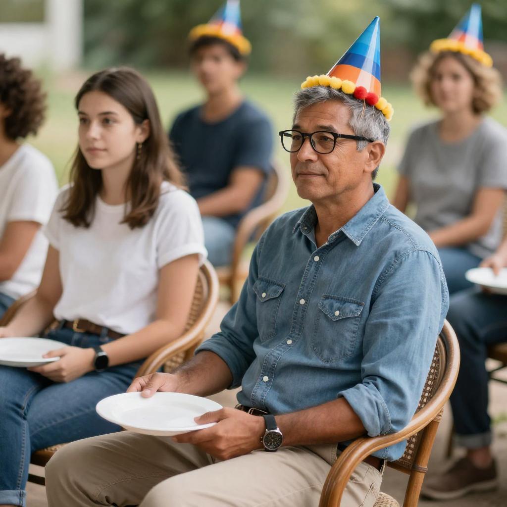 Photograph of an outdoor gathering. A middle-aged man with glasses, wearing a blue denim shirt and a colorful party hat, sits in a woven chair, holding a white plate. A young woman with shoulder-length brown hair, wearing a white shirt, sits beside him, also holding a plate. Background includes other seated people and greenery.