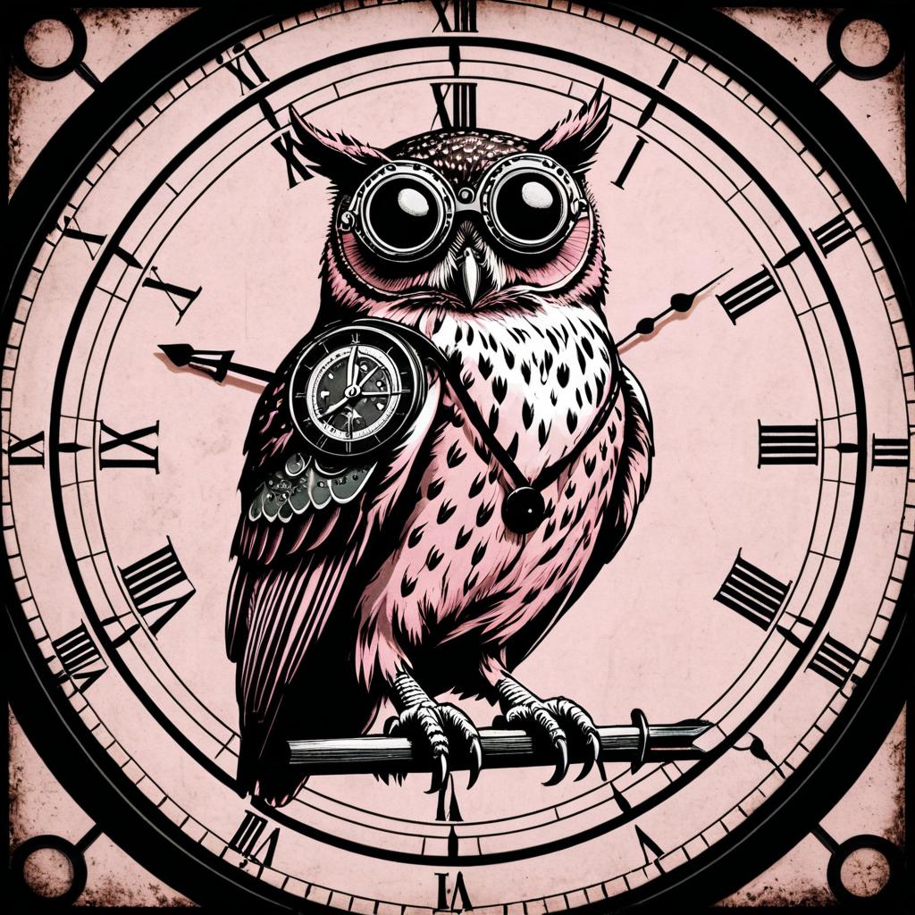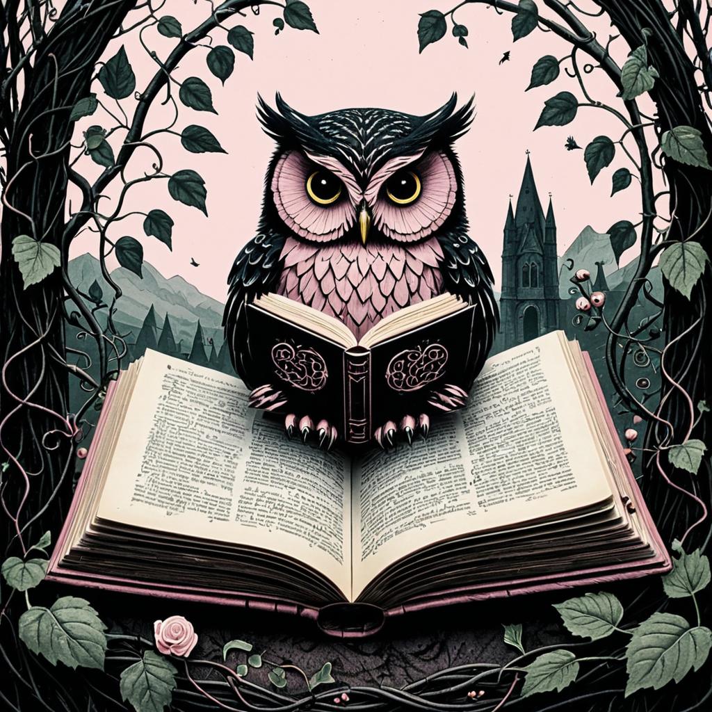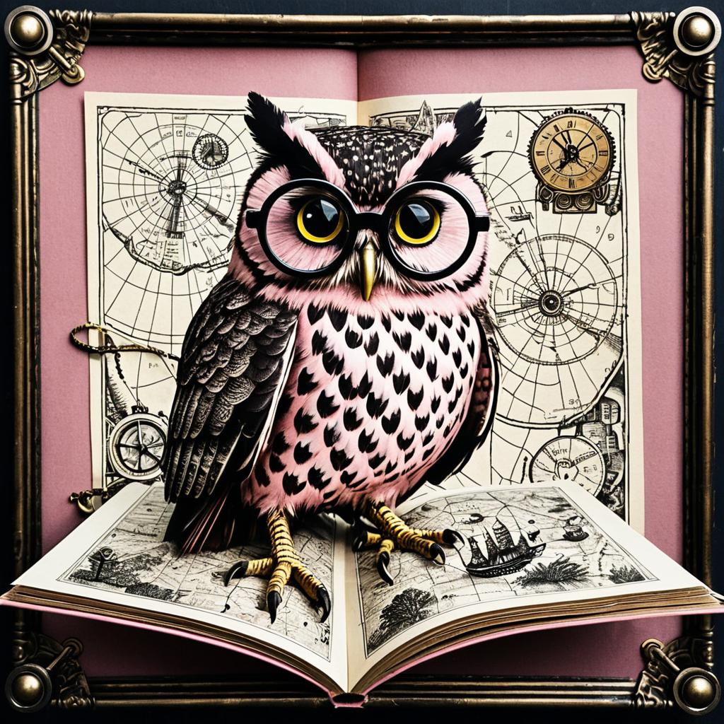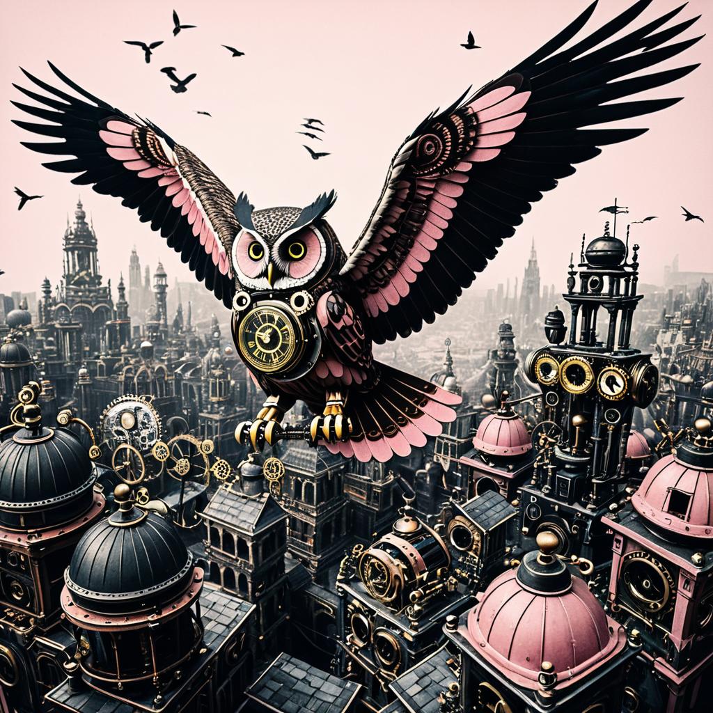A whimsical scene of an owl perched on a floating teacup, in the style of art nouveau and whimsical vintage. Birds-eye view, light pink and black tones, mystical and intriguing