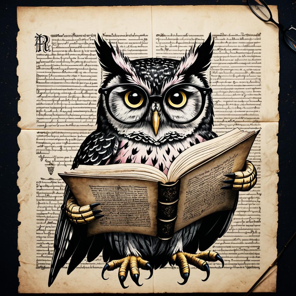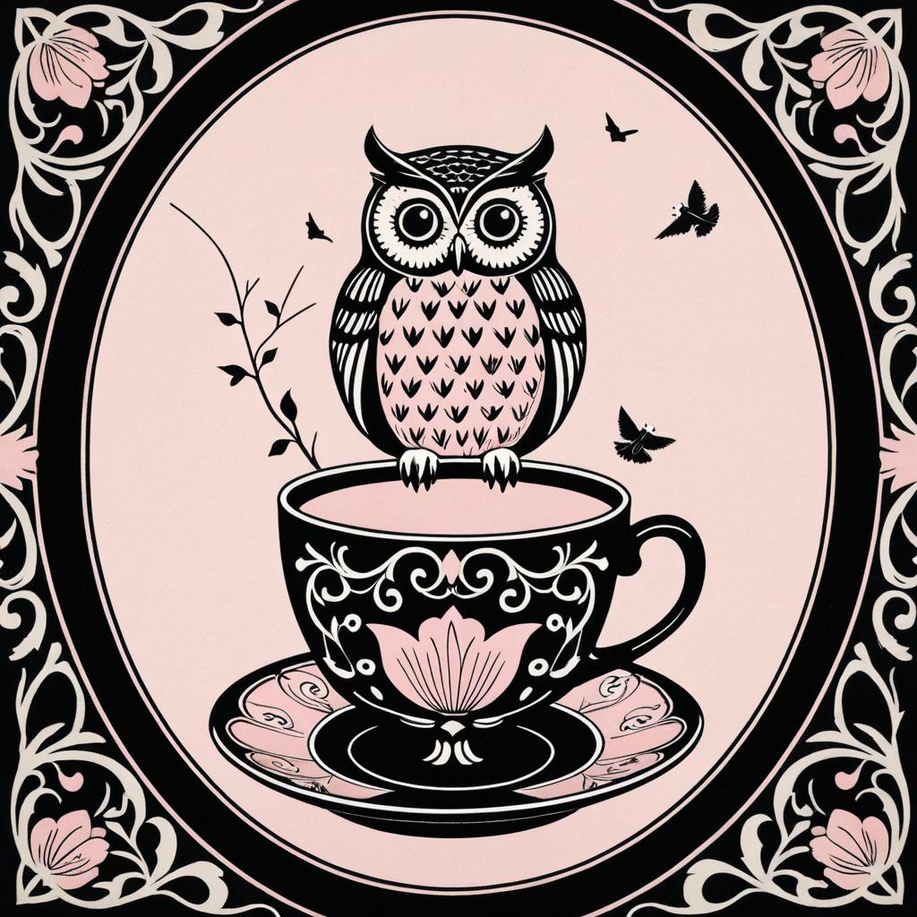 A whimsical vintage-style illustration featuring an owl perched on a floating teacup with an intricate Art Nouveau floral design. The composition uses light pink and black tones, bordered by decorative floral patterns, creating a mystical and intriguing atmosphere.