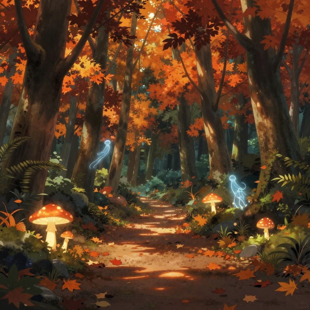 Anime forest background with autumn colors, warm oranges and reds, fallen leaves scattered on a narrow dirt trail, gentle sunlight casting long shadows, whimsical fantasy elements like glowing mushrooms and ethereal spirits, richly textured and highly detailed in anime style.