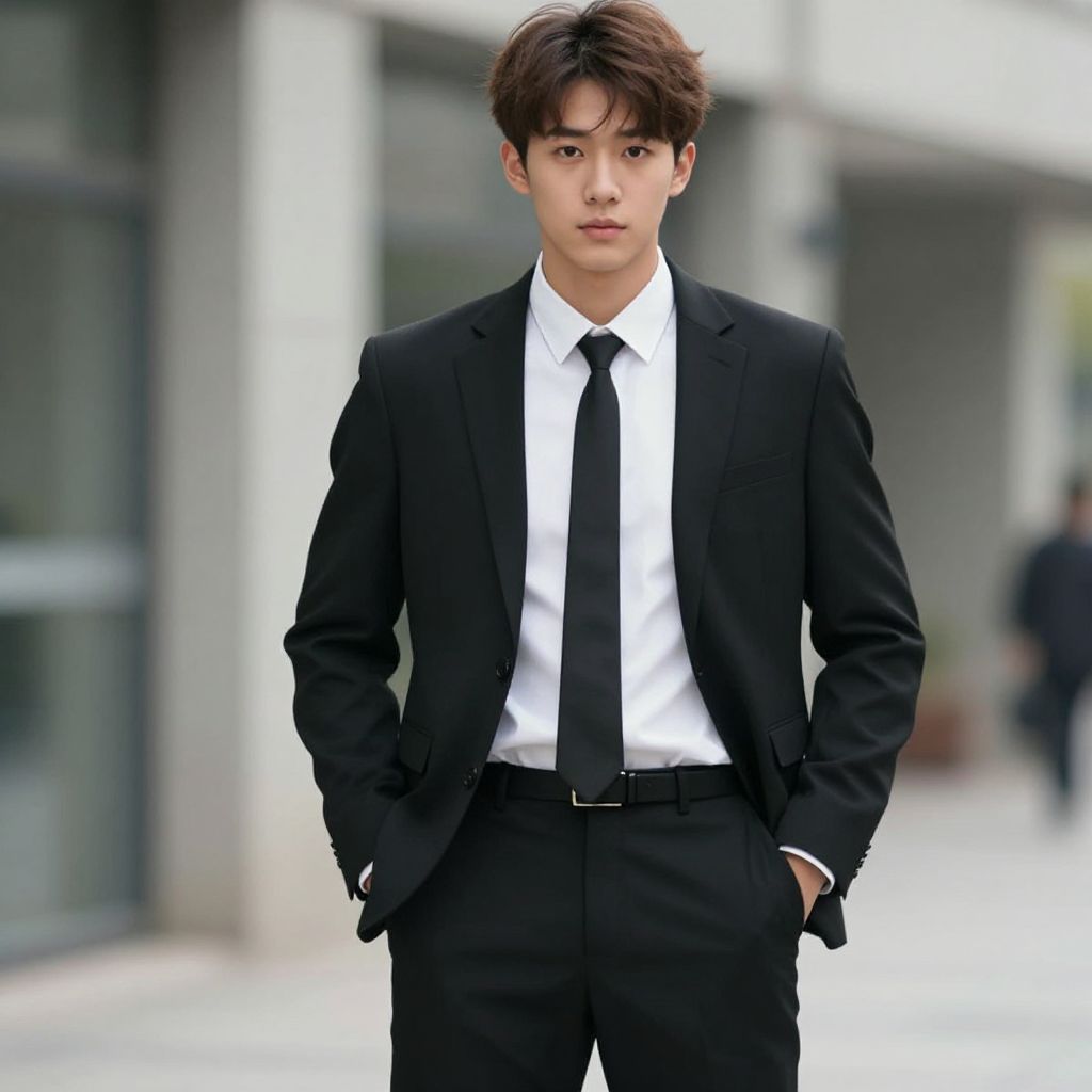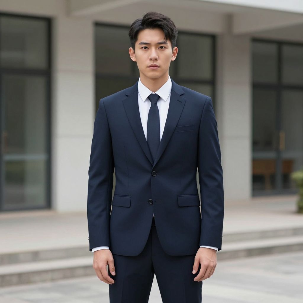 Photograph of a young East Asian man standing outdoors in front of a modern building with large, black-framed windows. He has short, black, slightly tousled hair and a serious expression. He is wearing a well-fitted, dark navy blue suit with a white dress shirt and a black tie. The suit jacket has a single breast pocket and two flap pockets on the front. The background includes a stone-paved area and the building's white and gray facade. The image has a sharp, professional quality with balanced lighting, emphasizing the formal attire and the man's composed demeanor.