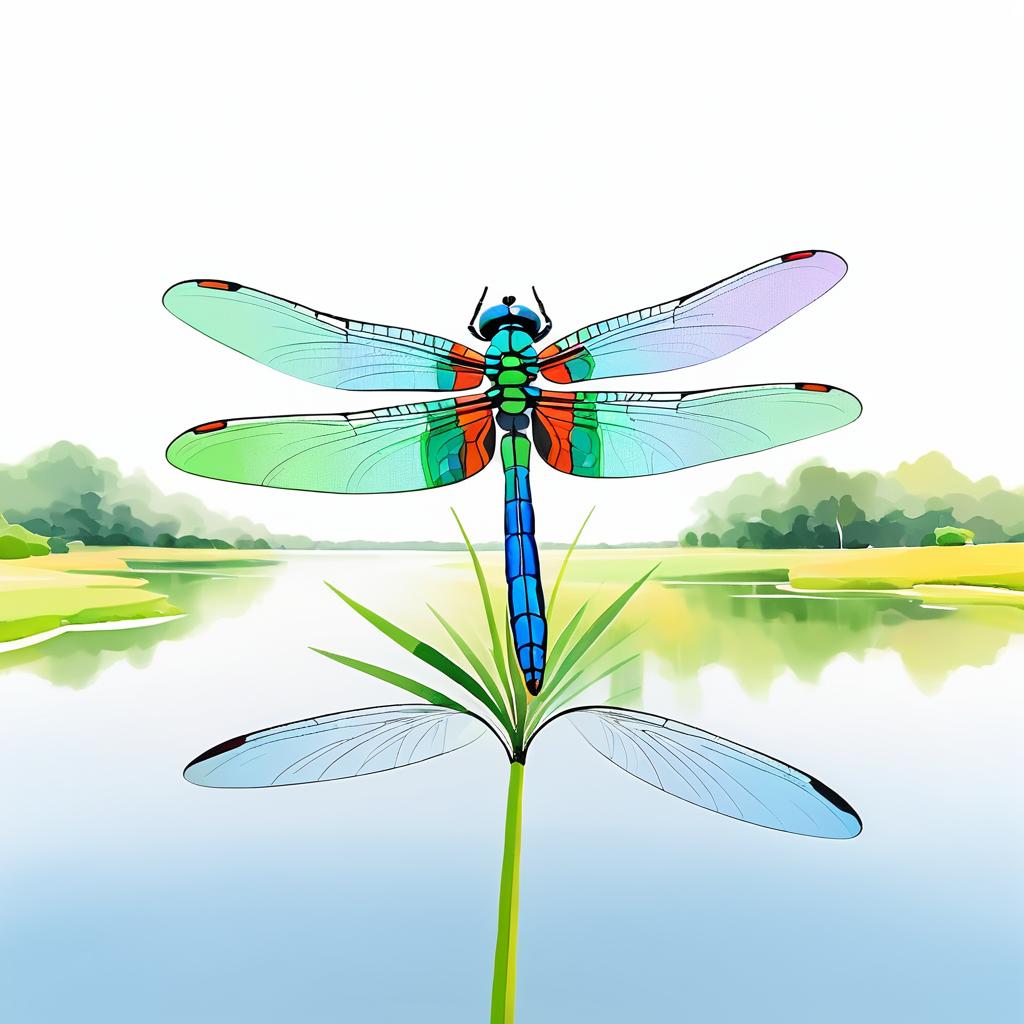 Landscape painting of a hand-drawn illustration of a dragonfly, in a minimalistic style with vibrant colors on a white background, high quality.