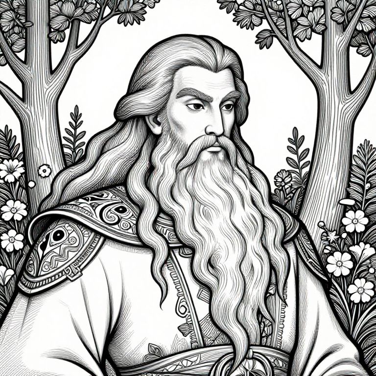 This artwork features a majestic figure with long hair and a flowing beard, set against a backdrop of stylized trees and flowers. The intricate linework and monochromatic palette create a captivating and mystical atmosphere, reminiscent of traditional folklore illustrations. The figure's elaborate attire adds depth to the imagery, evoking a sense of wisdom and strength.