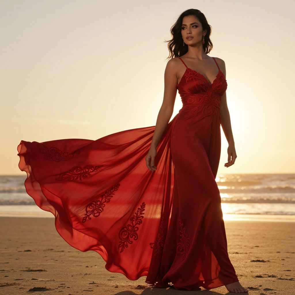 A sexy dress prompt: A flowing, silken red dress cascades down a graceful woman standing on a sun-drenched beach at sunset, golden light highlighting her silhouette and the dress's delicate embroidery. Soft breeze moves the fabric, evoking elegance and allure with natural lighting and cinematic composition.