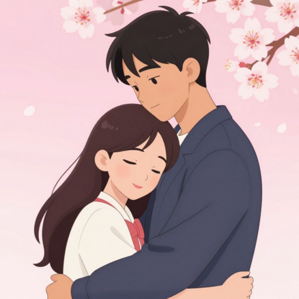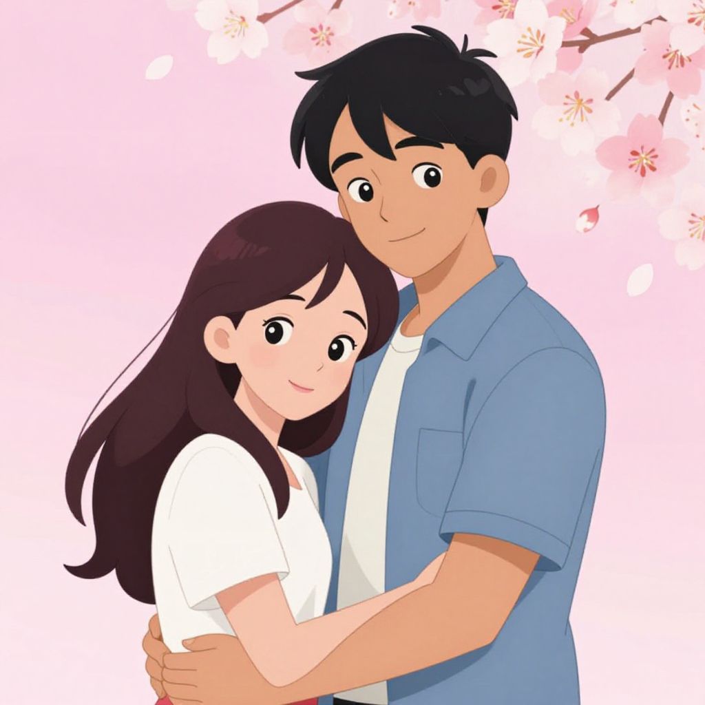 Two animated characters share a tender embrace, with the woman leaning affectionately against the man's shoulder, set against a soft pink background adorned with delicate cherry blossom petals.