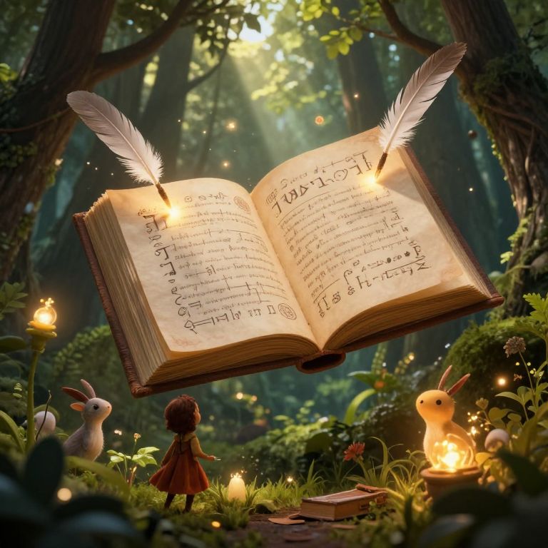 Fantasy scribes in an enchanted forest, large open books floating mid-air, magical runes glowing as they write with feather quills, whimsical attire with earthy tones, surrounded by glowing plants and creatures, ethereal ambiance with rays of sunlight through thick foliage.