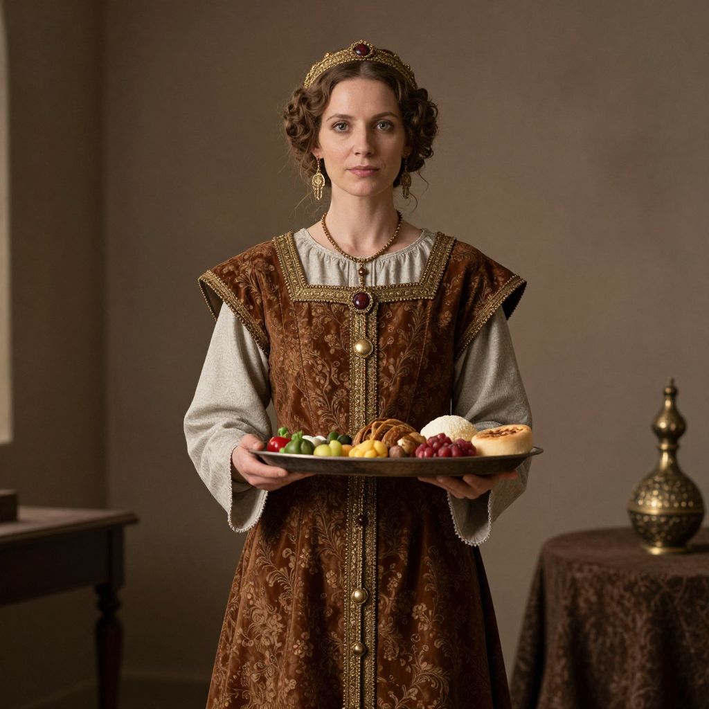 Photograph of a young woman with curly brown hair, wearing a medieval-style brown dress with gold embroidery, holding a plate of colorful fruits and pastries