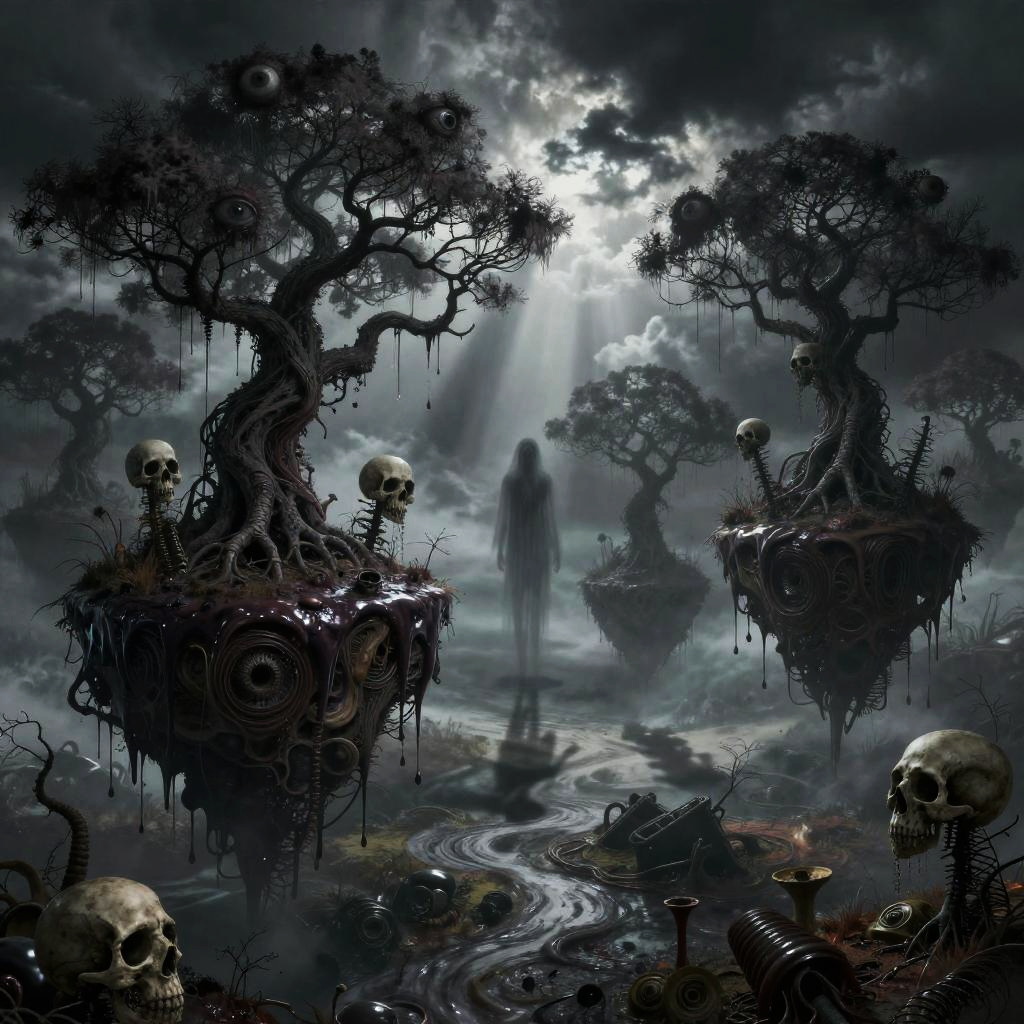 Surrealist horror landscape with floating islands dripping with viscous dark liquid, skeletal trees with eyes, phantom figures blending into a stormy sky, unsettling mix of organic and mechanical elements, eerie lighting casting long distorted shadows, dreamlike and terrifying.