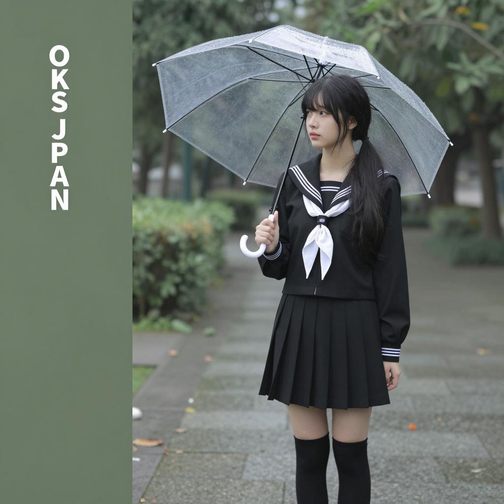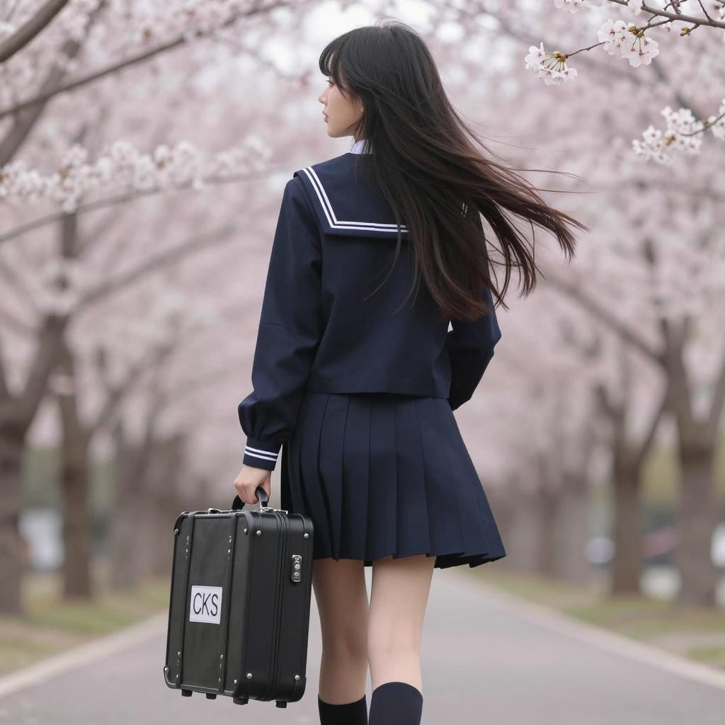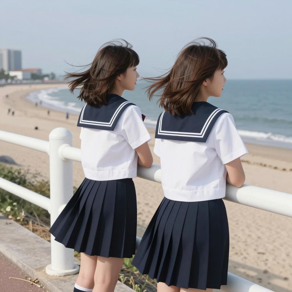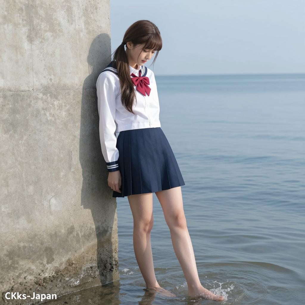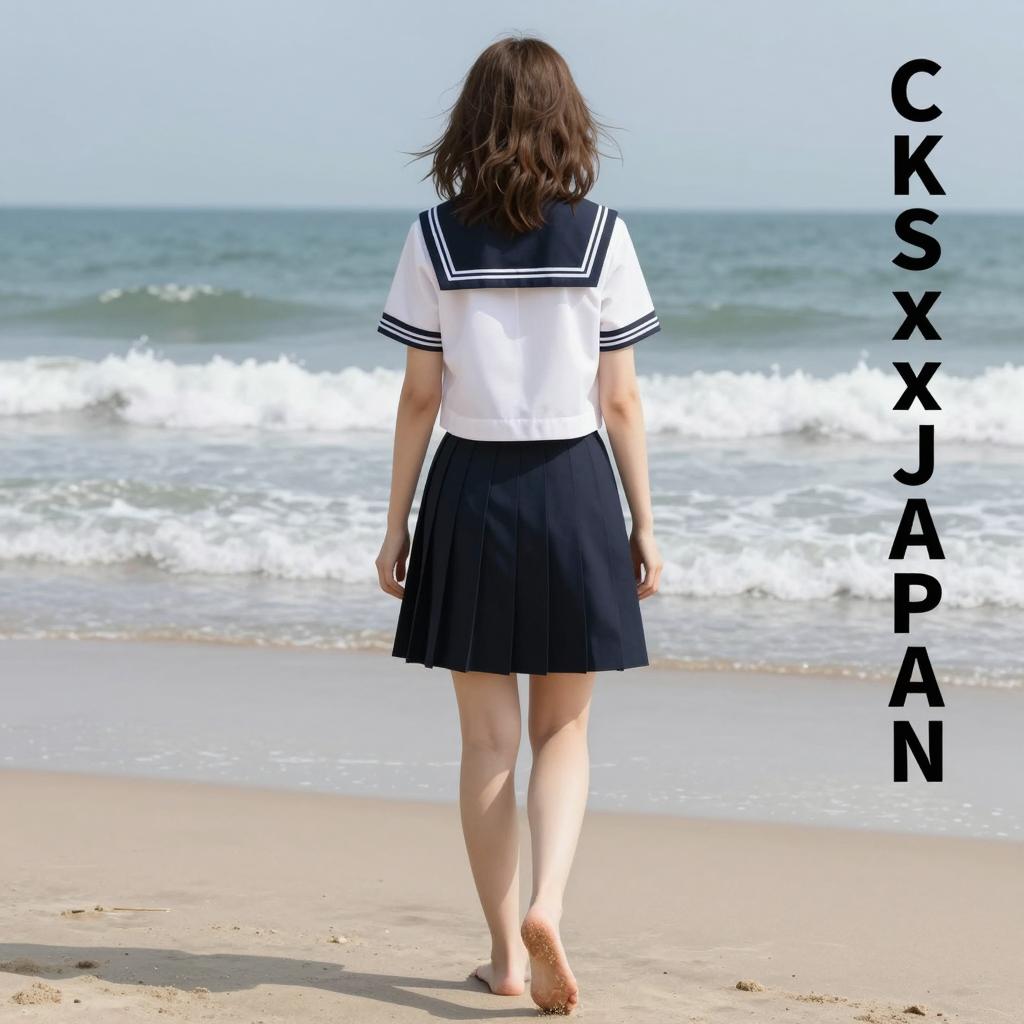 Photograph of a woman with light skin and brown hair wearing a blue sailor-style school uniform with a white shirt and dark pleated skirt. She is walking barefoot on a sandy beach with gentle waves in the background. Her back is to the camera. The "CKSxJAPAN" is on the right side of the image.