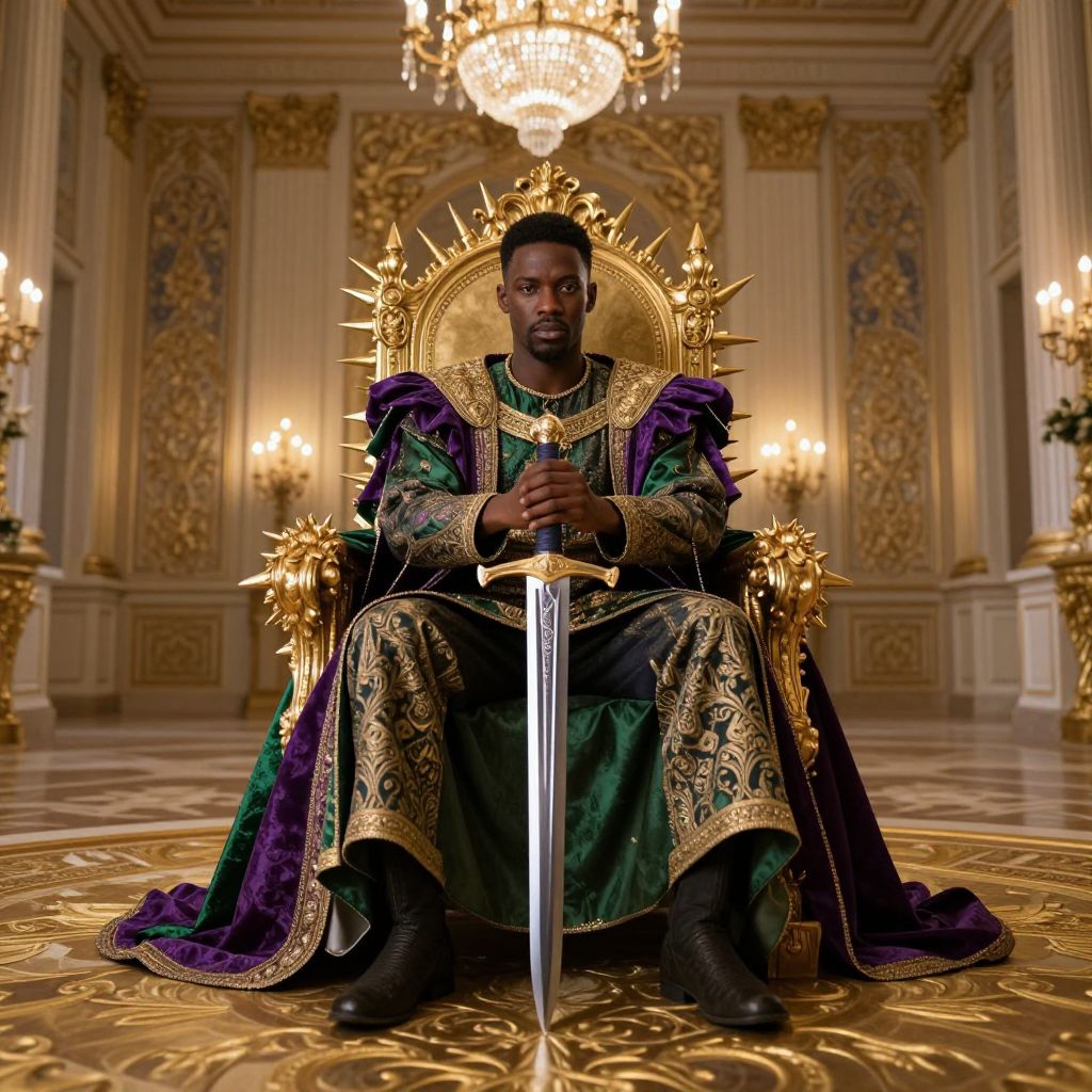 In a grand, opulent royal palace room, a regal figure sits majestically on a throne, exuding power and authority. The man, a handsome Black man, is adorned in a sumptuous ensemble of purple, green, and gold garments, his attire intricately detailed with elaborate patterns and textures. He holds a hyperrealistic, intricately designed sword with a sharp, reflective blade, its tip resting on the golden, complexly patterned floor. The throne, a symbol of his sovereignty, is ornately decorated with gold accents and spikes, adding to the regal ambiance. The room itself is a testament to luxury, with rich, ornate walls and a chandelier hanging overhead, casting a warm, cinematic light that enhances the hyperrealistic quality of the scene. The overall composition is balanced, with the figure centrally positioned, facing the camera, and the elements of the room arranged in a way that draws the viewer's eye towards the throne and the man upon it. The lighting is carefully crafted to highlight the textures and details of the man's attire and the throne, creating a cinematic and dramatic effect.