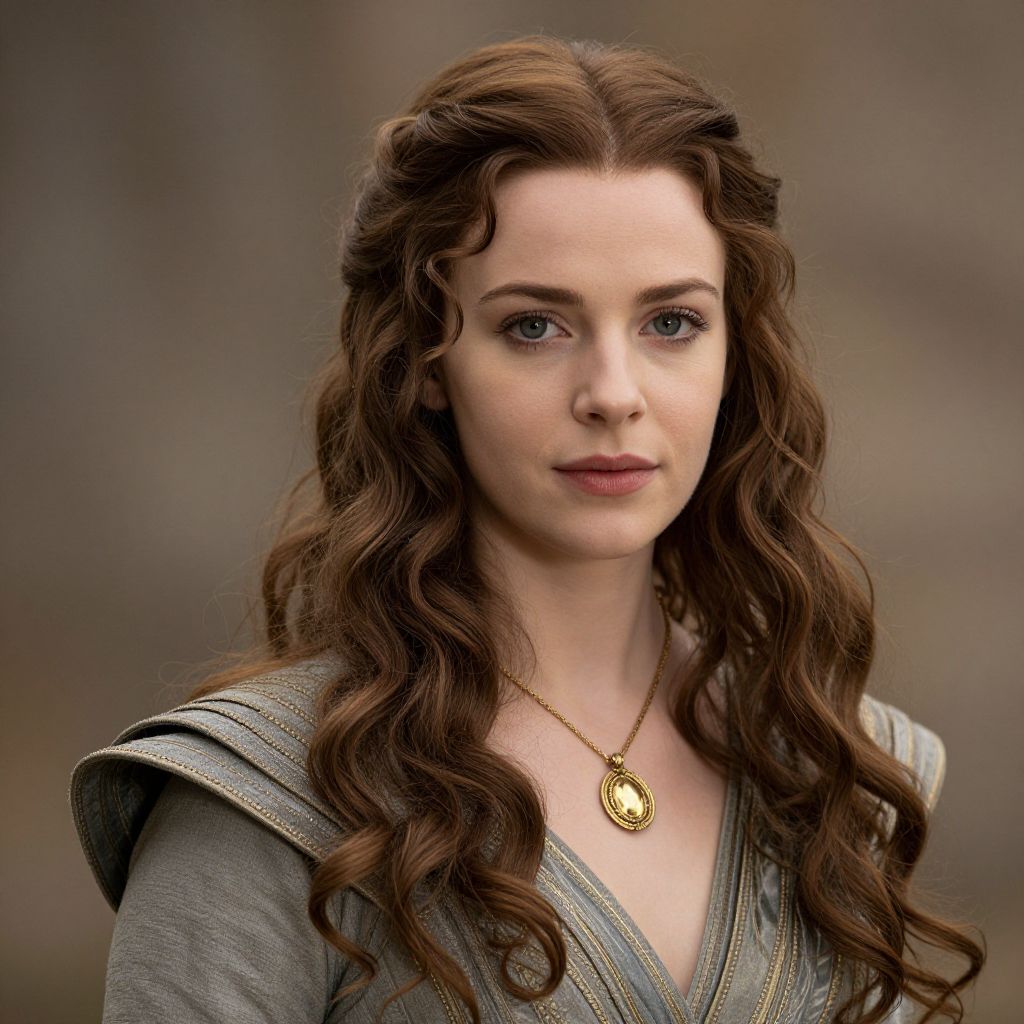 Photograph of a young white woman with wavy, chestnut brown hair cascading over her shoulders. She has fair skin, blue eyes, and wears a subtle pink lipstick. She is dressed in a medieval-style, grey, V-neck dress with gold trim on the shoulders. Around her neck is a gold necklace with a round, pendant-like medallion. The background is softly blurred in earthy tones, drawing focus to her face and attire. Her expression is calm and slightly serious. The image has a realistic, cinematic quality.