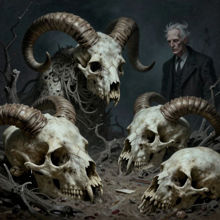 This digital artwork depicts a dark, eerie scene with four large, horned skulls with decayed, rib-like textures and cracked surfaces, positioned in the foreground. In the background, a pale, elderly man with white hair, dressed in a dark, Victorian-style suit, stands observing the scene with a serious expression. The background is a murky, dark blue-gray, creating a foreboding atmosphere. The ground is strewn with bones and dried blood, enhancing the macabre tone. The lighting is low, highlighting the skulls and the man's face while casting shadows that add depth to the image. The overall style is realistic with a gothic, horror aesthetic.