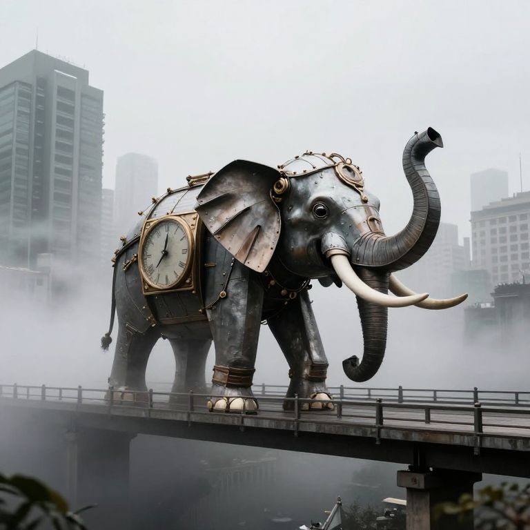 A clockwork elephant made of fog toils across a sky-bridge, its timepiece tusks ticking out the heartbeat of forgotten cities.
