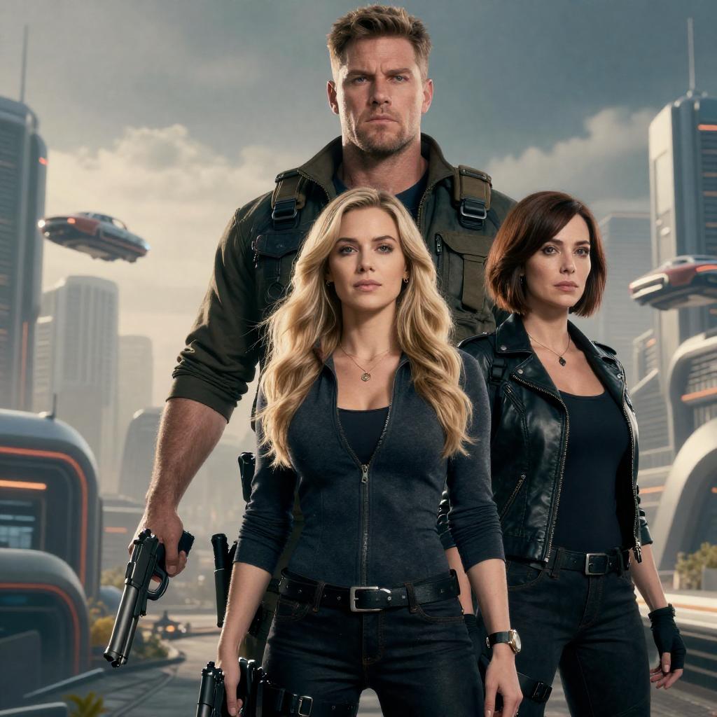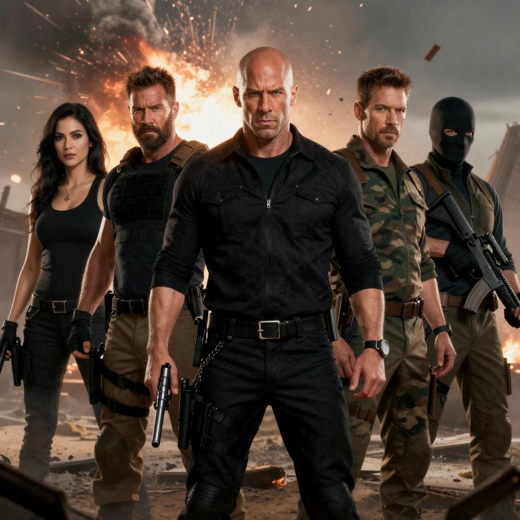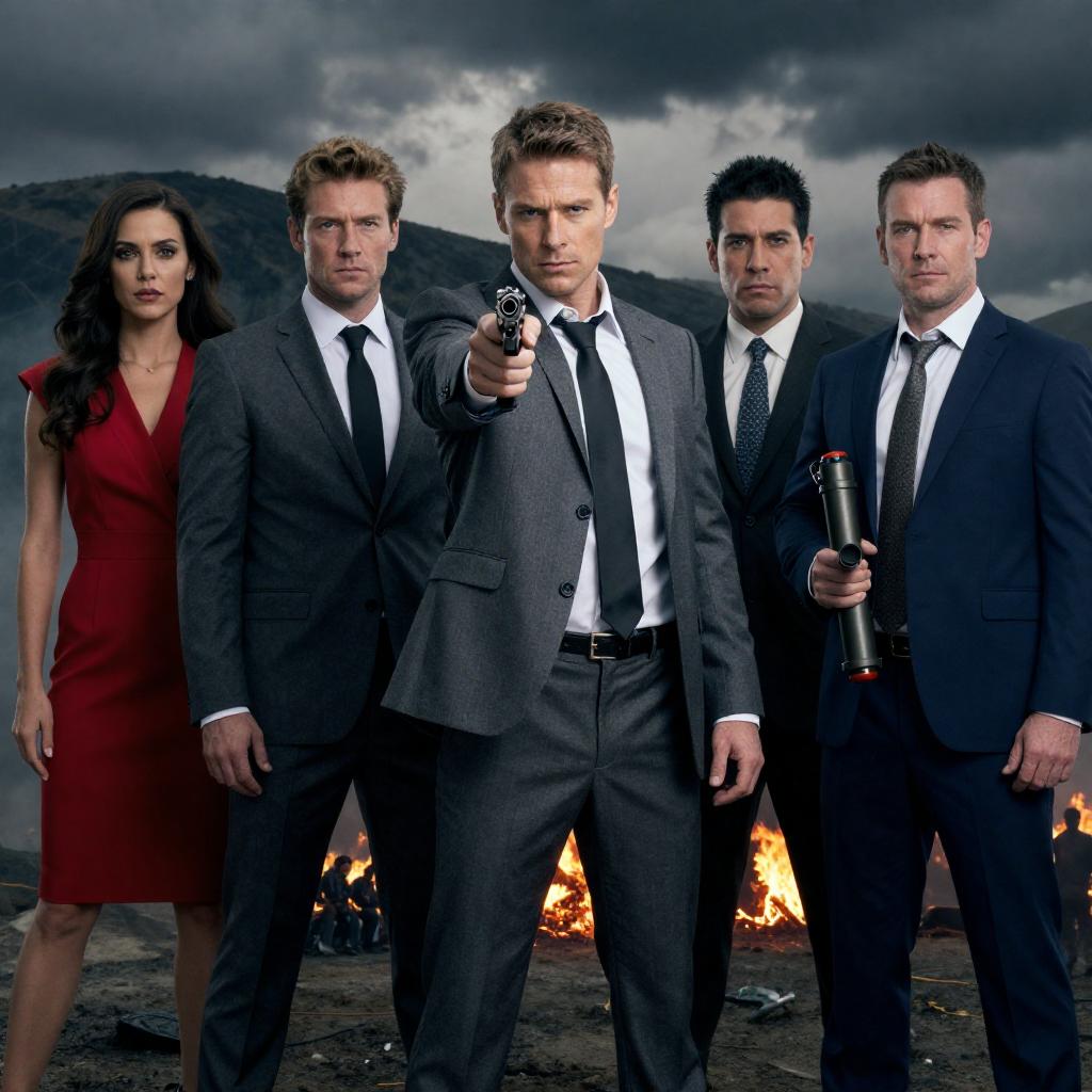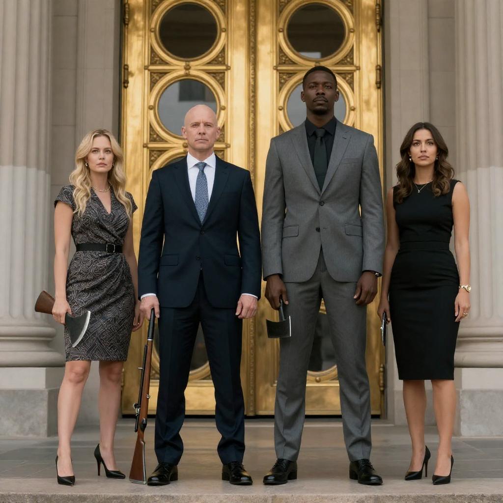 Photograph of four people standing in front of ornate, golden doors with large, circular patterns. Three hold large axes, one holds a rifle. Blonde woman in patterned dress, bald man in suit, tall Black man in gray suit, woman in black dress. All have serious expressions. Tall columns in background.