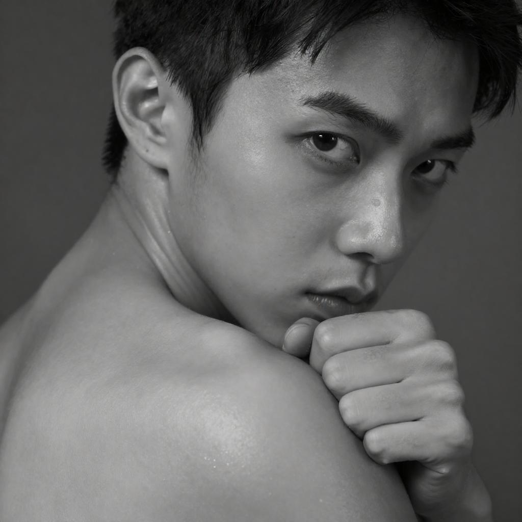 Black-and-white photograph of a close-up of a person with short, dark hair, intense eyes, and slightly sweaty skin. They are gripping another person's shoulder with their right hand, partially obscuring the shoulder. The second person's shoulder is in the foreground, showing visible ure and sweat. The person's fingers are slightly bent, and the focus is on their eyes and the shoulder.