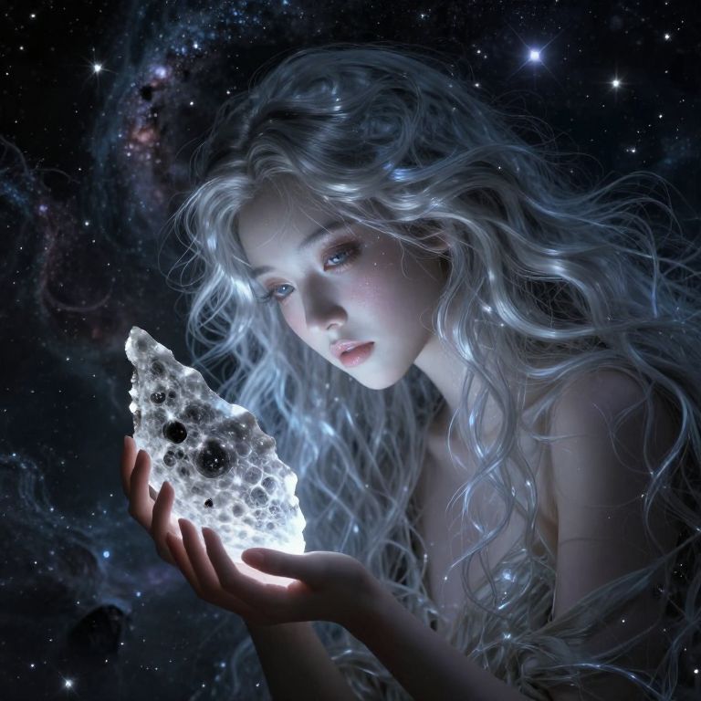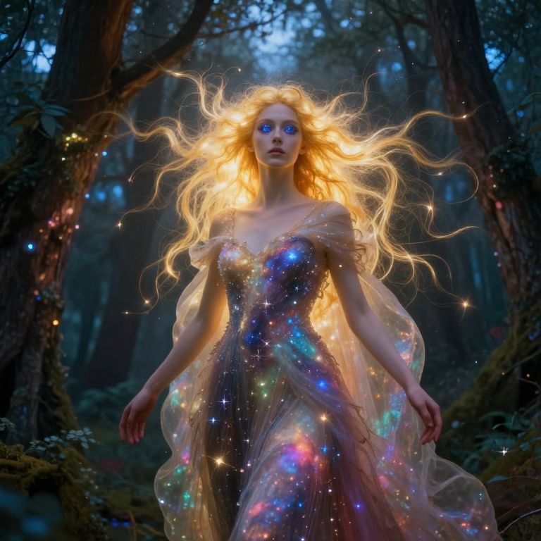 A captivating portrait depicting an enigmatic celestial figure with emerald eyes and silver hair, gracefully floating amidst a mesmerizing vortex of cosmic dust in the vast expanse of an otherworldly nebula. Her expression conveys both wisdom and mystery as she gazes directly at the viewer, her outstretched hand wielding a glowing crystal wand that casts an iridescent light upon her surroundings, illuminating intricate constellations etched into the backdrop of this captivating interstellar realm, evoking the dreamlike atmosphere of surrealist painters while maintaining an air of enigma.