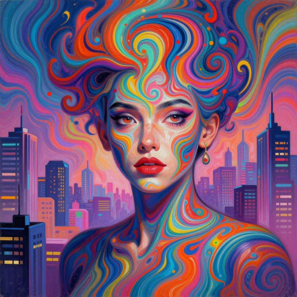 AI to create art representation, virtual artist avatar painting psychedelic murals in a virtual reality cityscape, vibrant swirling colors, fluid motion, synthwave aesthetic, combining traditional brush techniques with digital enhancements