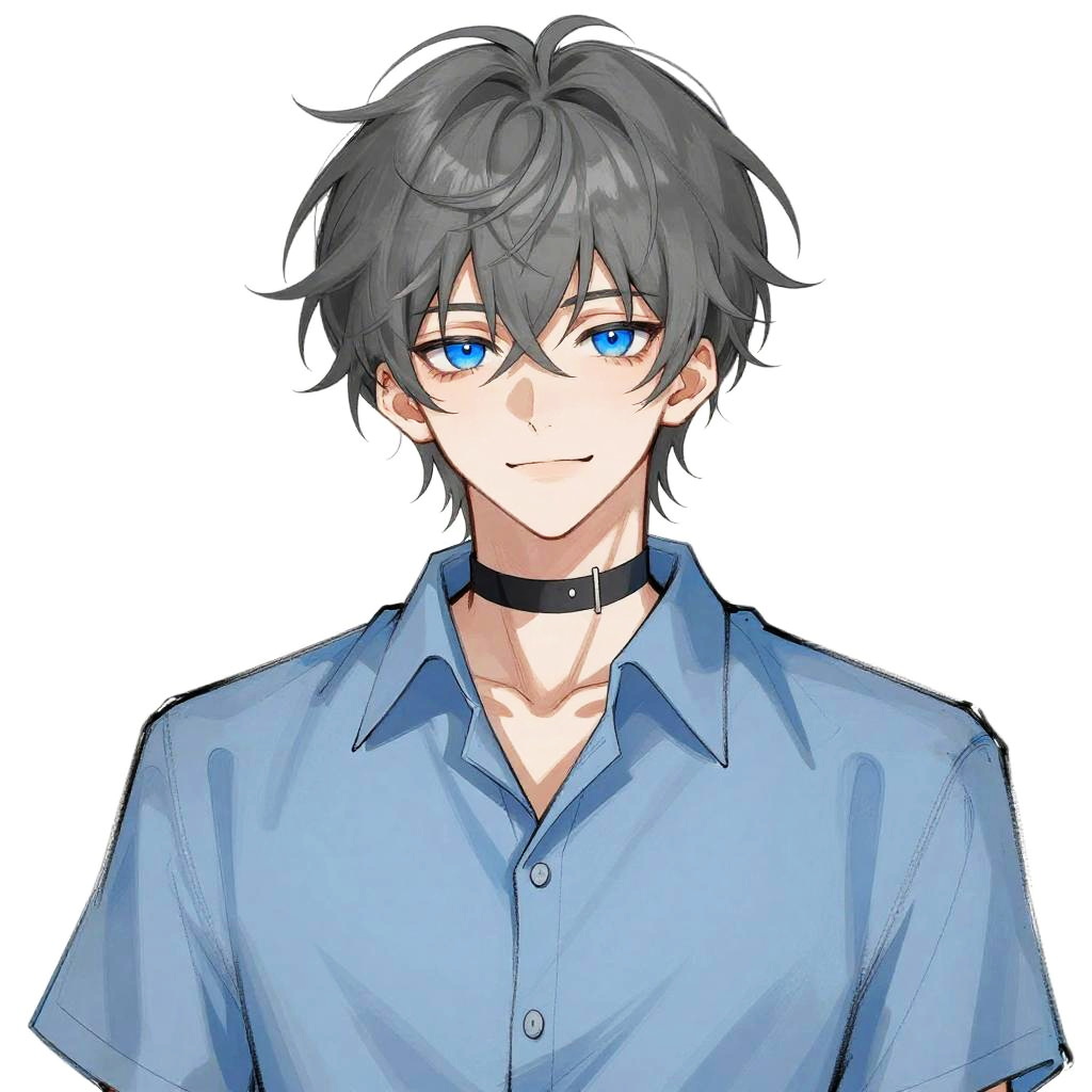 This is a digital anime-style drawing of a young person with messy, wavy gray hair and piercing blue eyes. They're wearing a light blue button-up shirt and a choker necklace. Their expression is slightly smirky, and they're looking directly at the viewer. The background is plain white, making the character stand out. The overall style is clean and detailed with a cool color palette.