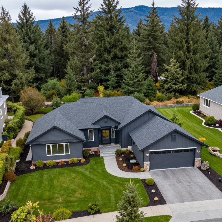 Aerial photograph of a modern, dark gray, single-story house with a shingle roof, nestled in a lush, green, forested area. The house features large windows and a double garage with a concrete driveway. A well-manicured lawn surrounds the house, bordered by shrubs and small plants. Tall evergreen trees form a dense backdrop, with mountains visible in the distance under a partly cloudy sky. The house's exterior walls are smooth, and the front entrance is centered under a small gable. A neighboring house is partially visible on the right.