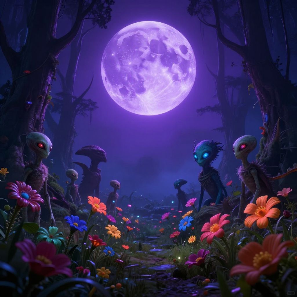 Alien forest illuminated by a giant purple moon, colorful alien flowers blooming everywhere, strange wildlife with glowing eyes, misty background, sci-fi fantasy hybrid, ultra detailed