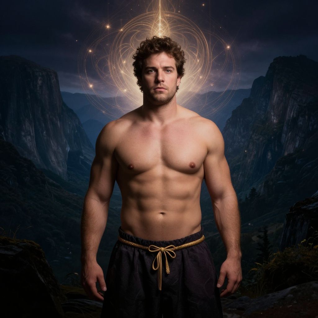 Photograph of a muscular, shirtless white man with curly brown hair and a serious expression, standing in a dark, mountainous landscape. He has a well-defined, toned physique with visible abs and chest muscles. He wears black pants with a gold drawstring. Behind him, a glowing, golden halo with concentric circles and stars is set against a deep blue, starry night sky. The mountains are silhouetted, adding depth to the background. The image has a mystical, celestial feel, blending natural and supernatural elements.
