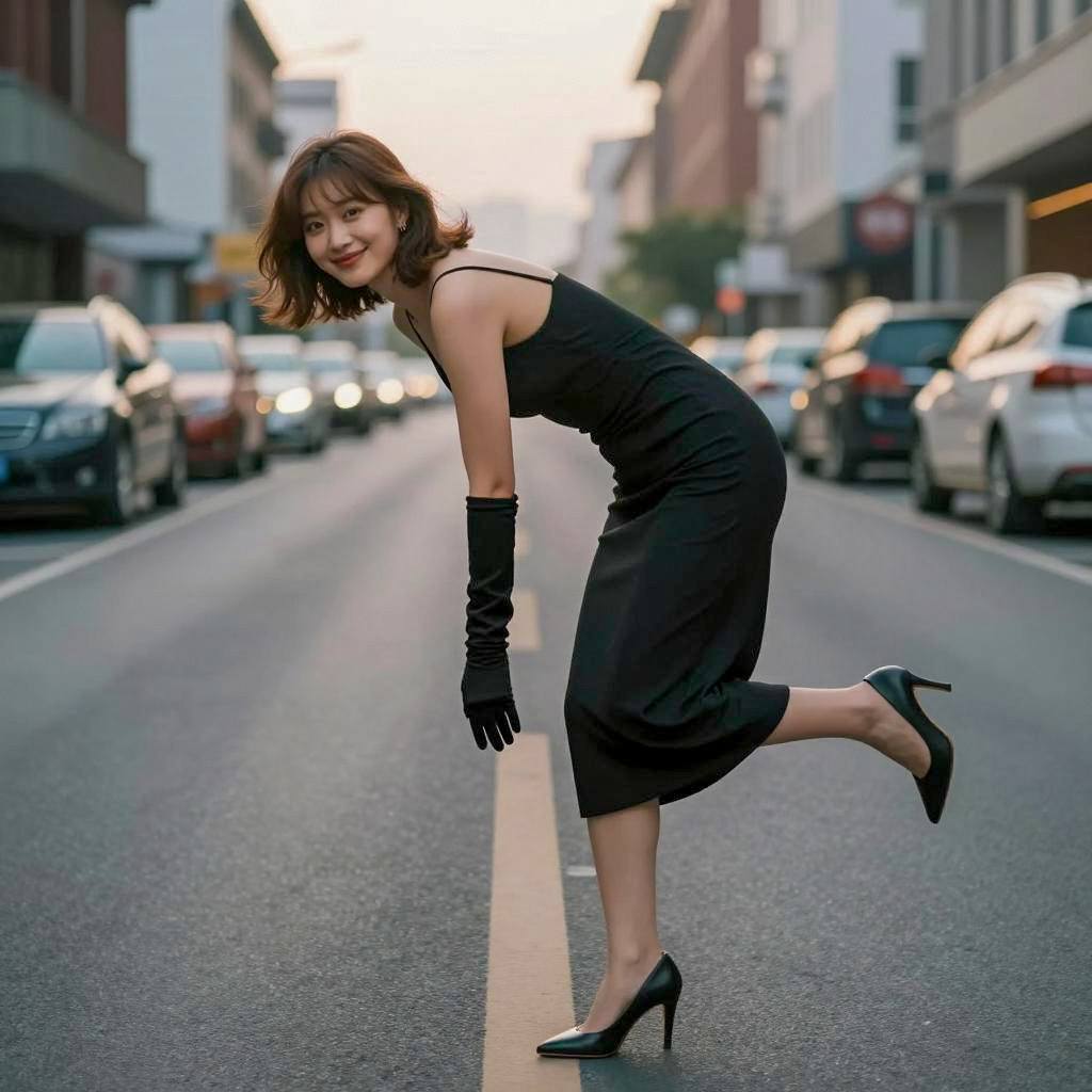 Woman in black dress, long gloves, and black heels, standing on street, bending forward, smiling, brown short hair, holding one leg up. Urban background with cars and buildings. Evening light. Vertical image.