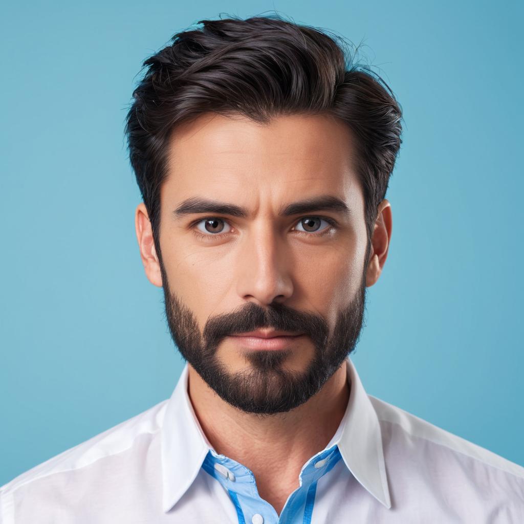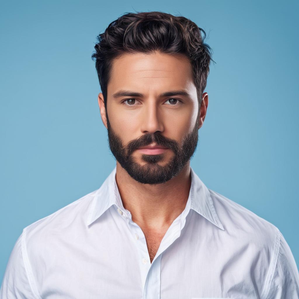 Portrait of a confident young man with dark hair and a full beard wearing a white button-down shirt, posing against a plain blue background. The man has light skin and sharp facial features.