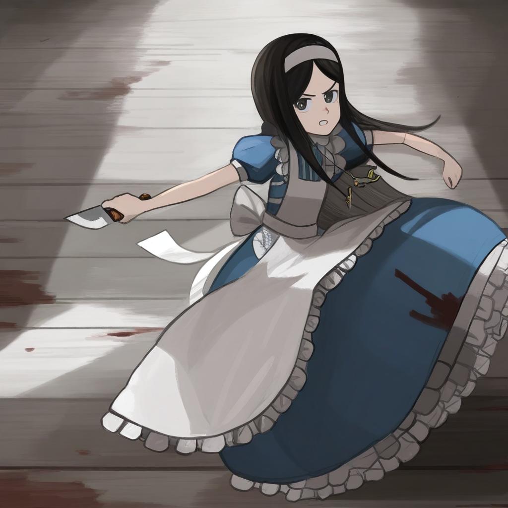 Digital artwork of Alice Liddell from American McGee's Alice, depicted with long black hair, green eyes, and a fierce expression. She wears a blue dress with puffed sleeves and a white apron, holding a knife in a dynamic action pose. The image features a wooden floor background with bloodstains, emphasizing a dark, intense atmosphere.