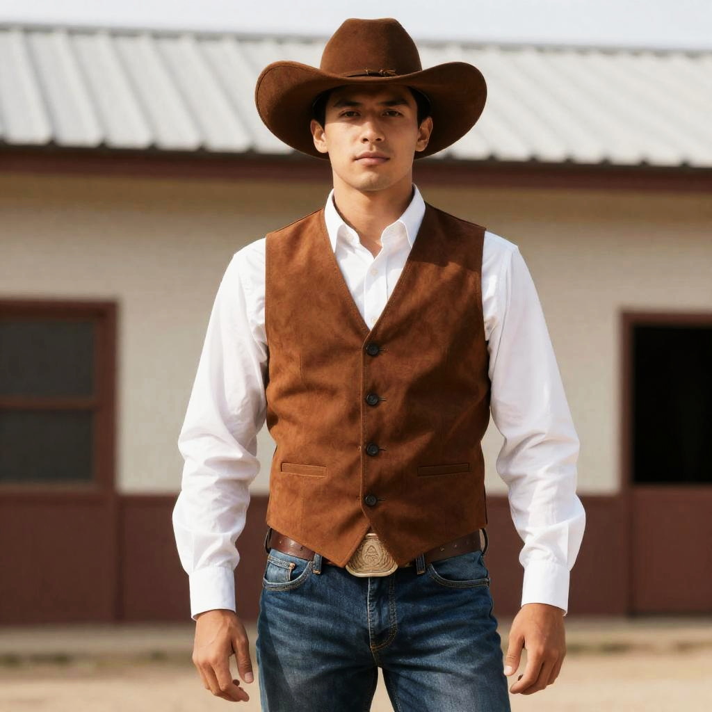 Man Wild West, cowboy in a brown vest and hat standing in a town square